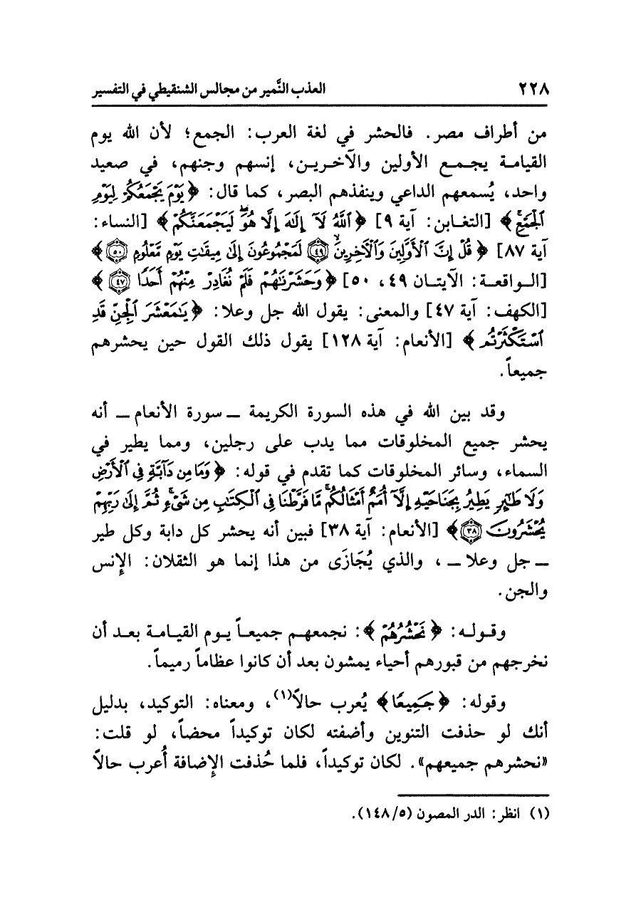 من أطراف مصر. فالحشر في لغة العرب: الجمع؛ لأن اللَّهَ يومَ القيامةِ يجمعُ الأَوَّلِينَ وَالآخِرِينَ، إِنْسَهُمْ وِجِنَّهُمْ، في صعيدٍ واحدٍ، يُسْمِعُهُمُ الداعي وينفذهم البصرُ، كما قال: {يَوْمَ يَجْمَعُكُمْ لِيَوْمِ الْجَمْعِ} [التغابن: آية ٩] {اللَّهُ لَا إِلَهَ إِلَاّ هُوَ لَيَجْمَعَنَّكُمْ} [النساء: آية ٨٧] {قُلْ إِنَّ الْأَوَّلِينَ وَالْآخِرِينَ (٤٩) لَمَجْمُوعُونَ إِلَى مِيقَاتِ يَوْمٍ مَّعْلُومٍ (٥٠)} [الواقعة: الآيتان ٤٩، ٥٠] {وَحَشَرْنَاهُمْ فَلَمْ نُغَادِرْ مِنْهُمْ أَحَدًا (٤٧)} [الكهف: آية ٤٧] والمعنَى: يقول اللَّه جل وعلا: {يَا مَعْشَرَ الْجِنِّ قَدِ اسْتَكْثَرْتُمْ} [الأنعام: آية ١٢٨] يقول ذلك القولَ حين يحشرهم جميعًا.