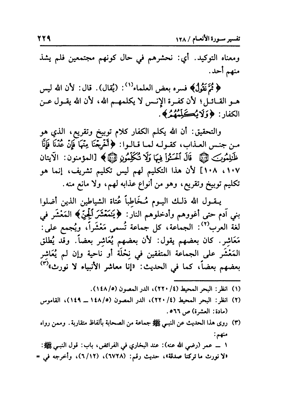 يقولُ اللَّهُ ذلك اليومَ مُخَاطِبًا عُتاةَ الشياطين الذين أَضَلُّوا بَنِي آدمَ حتى أَغْوَوْهُمْ وأدخلوهم النارَ: {يَا مَعْشَرَ الْجِنِّ} المَعْشَرُ في لغةِ العربِ (¬٢): الجماعةُ، كُلُّ جماعةٍ تُسَمَّى مَعْشَرًا، وَيُجْمَعُ على: مَعَاشِرَ. كان بعضُهم يقولُ: لأن بعضَهم يُعاشِرُ بعضًا. وقد يُطْلَقُ المَعْشَرُ على الجماعةِ المتفقين في نِحْلَةٍ أو ناحيةٍ وإن لم يُعَاشِرْ بعضُهم بعضًا، كما في الحديثِ: «إِنَّا مَعَاشِرَ الأَنْبِيَاءِ لَا نُورَثُ» (¬٣)