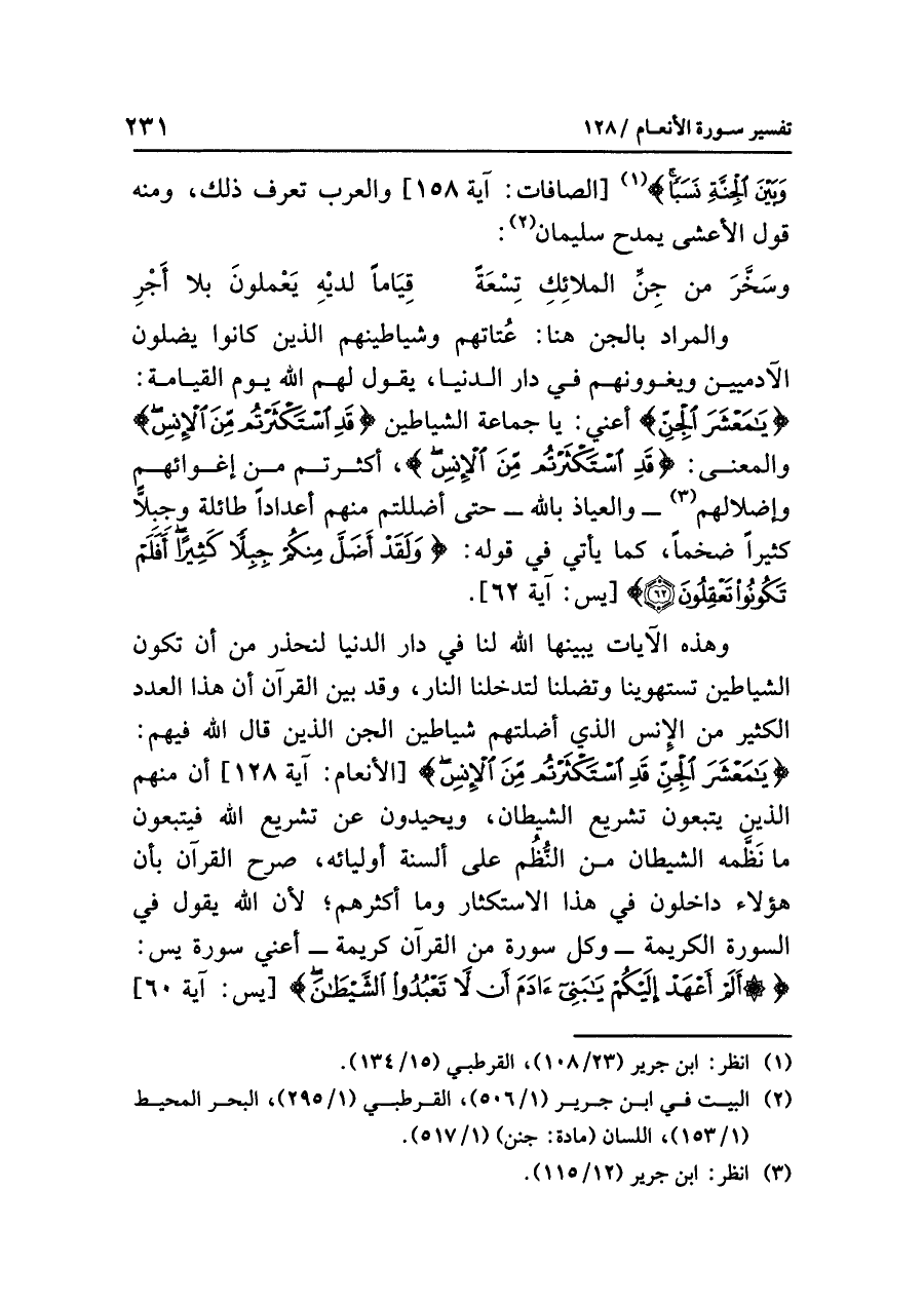 والمرادُ بالجنِّ هنا: عُتَاتُهُمْ وشياطينُهم الذين كانوا يُضِلُّونَ الآدميين ويغوونهم في دارِ الدنيا، يقولُ لهم اللَّهُ يومَ القيامةِ: {يَا مَعْشَرَ الْجِنِّ} أَعْنِي: يا جماعةَ الشياطين {قَدِ اسْتَكْثَرْتُم مِّنَ الإِنْسِ} والمعنَى: {قَدِ اسْتَكْثَرْتُم مِّنَ الإِنْسِ} أَكْثَرْتُمْ من إغوائِهم وإضلالِهم (¬٣) - والعياذُ باللَّهِ- حتى أَضْلَلْتُمْ منهم أعدادًا طائلةً وَجِبِلاًّ كثيرًا ضَخْمًا، كما يأتِي في قولِه: {وَلَقَدْ أَضَلَّ مِنْكُمْ جِبِلاًّ كَثِيرًا أَفَلَمْ تَكُونُوا تَعْقِلُونَ (٦٢)} [يس: آية ٦٢].