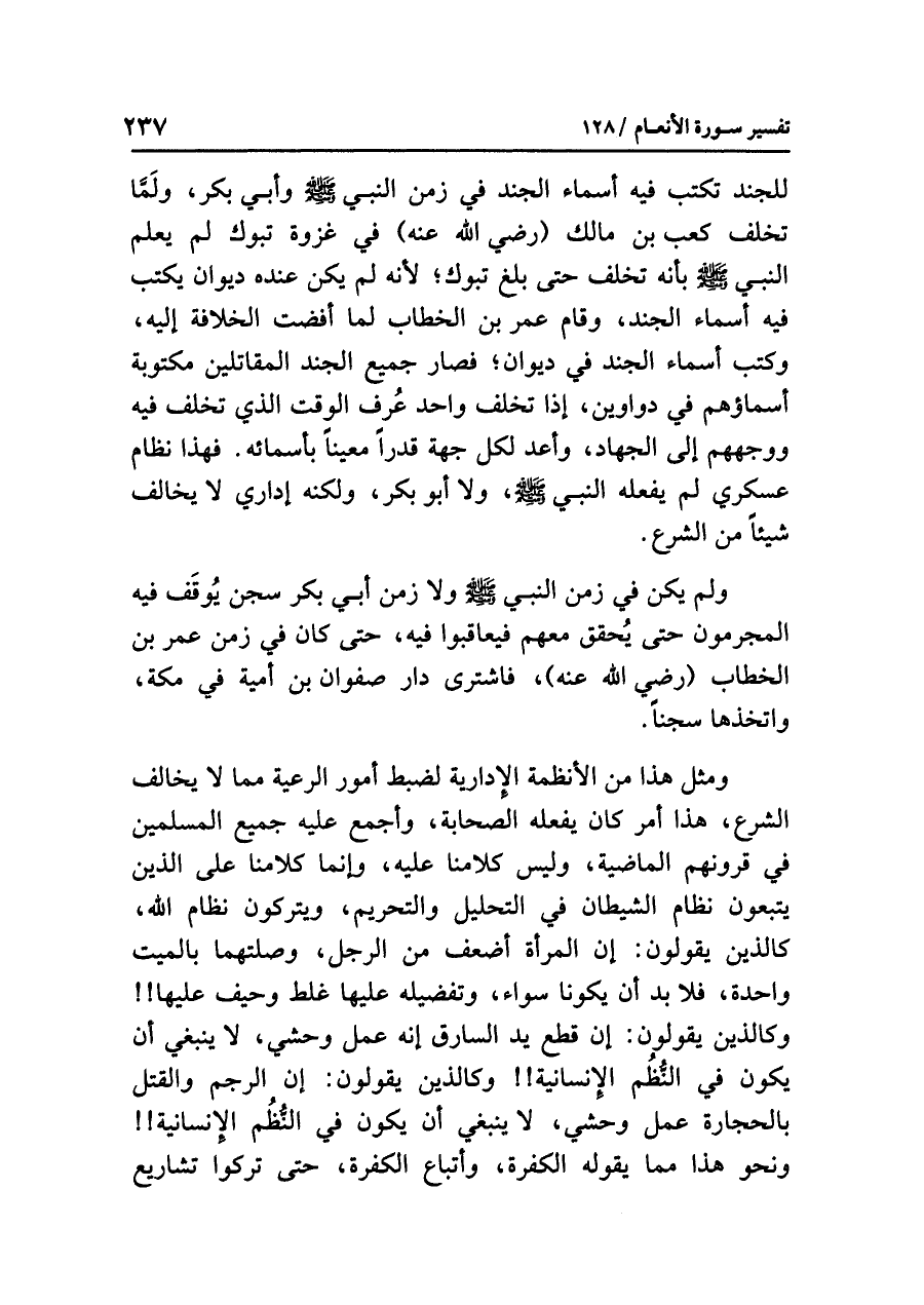 ومثلُ هذا من الأنظمةِ الإداريةِ لضبطِ أمورِ الرعيةِ مما لا يخالفُ الشرعَ، هذا أمرٌ كان يفعلُه الصحابةُ، وأجمعَ عليه جميعُ المسلمينَ في قرونِهم الماضيةِ، وليس كلامُنا عليه، وإنما كلامُنا على الذين يتبعونَ نظامَ الشيطانِ في التحليلِ والتحريمِ، ويتركونَ نظامَ اللَّهِ، كالذين يقولونَ: إن المرأةَ أضعفُ من الرجلِ، وَصِلَتُهُمَا بالميتِ واحدةٌ، فلابدَّ أن يكونَا سواءً، وتفضيلُه عليها غلطٌ وَحَيْفٌ عليها!! وكالذين يقولونَ: إن قَطْعَ يدِ السارقِ إنه عملٌ وحشيٌّ، لا ينبغي أن يكونَ في النُّظُمِ الإنسانيةِ!! وكالذين يقولونَ: إن الرجمَ والقتلَ بالحجارةِ عملٌ وحشيٌّ، لا ينبغي أن يكونَ في النُّظُمِ الإنسانيةِ!! ونحو هذا مما يقولُه الكفرةُ وأتباعُ الكفرةِ، حتى تَرَكُوا تشاريعَ