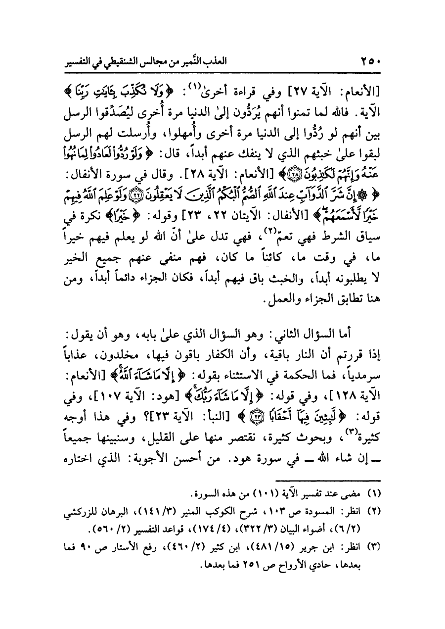 أما السؤالُ الثاني: وهو السؤالُ الذي على بابِه، وهو أن يقولَ: إذا قَرَّرْتُمْ أن النارَ باقيةٌ، وأن الكفارَ بَاقُونَ فيها مخلدونَ، عَذَابًا سَرْمَدِيًّا، فما الحكمةُ في الاستثناءِ بقولِه: {إِلَاّ مَا شَاءَ اللَّهُ} [الأنعام: الآية ١٢٨] وفي قولِه: {إِلَاّ مَا شَاءَ رَبُّكَ} [هود: الآية ١٠٧] وفي قولِه: {لَابِثِينَ فِيهَا أَحْقَابًا (٢٣)} [النبأ: الآية ٢٣]؟ وفي هذا أوجهٌ كثيرةٌ (¬٣)، وبحوثٌ كثيرةٌ نقتصرُ منها على القليلِ، وَسَنُبَيِّنُهَا جميعًا- إن شاءَ اللَّهُ- في سورةِ هودٍ.