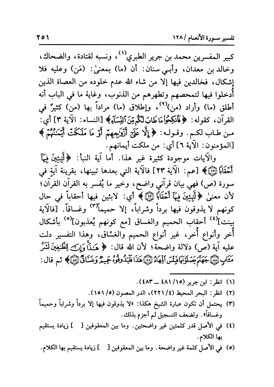 والآياتُ موجودةٌ كثيرةٌ غيرُ هذا. أما آيةُ النبأِ: {لَابِثِينَ فِيهَا أَحْقَابًا (٢٣)} [عم: الآية ٢٣] فالآيةُ التي بعدَها تُبَيِّنُهَا، بقرينةِ آيةٍ فِي سورةِ (ص) فَهِيَ بيانٌ قُرْآنِيٌّ وَاضِحٌ، وخيرُ ما يُفَسَّرُ به القرآنُ القرآنُ؛ لأَنَّ معنَى: {لَابِثِينَ فِيهَا أَحْقَابًا (٢٣)} أي: لَابِثِينَ فيها أَحْقَابًا فِي حالِ كونِهم لَا يذوقونَ فيها بَرْدًا وَشَرَابًا إلا حميمًا (¬٣) وغساقًا. [فالآيةُ بَيَّنَتْ] (¬٤) أحقابَ الحميمِ والغساقِ [مع كونِهم يُعَذَّبُونَ] (¬٥) بأشكالٍ أُخَرَ وأنواعٍ أُخَرَ، غيرِ أنواعِ الحميمِ والغسَّاقِ، وهذا التفسيرُ دَلَّتْ عليه آيةُ (ص) دلالةً واضحةً؛ لأَنَّ اللَّهَ قال: {هَذَا وَإِنَّ لِلطَّاغِينَ لَشَرَّ مَآبٍ (٥٥) جَهَنَّمَ يَصْلَوْنَهَا فَبِئْسَ الْمِهَادُ (٥٦) هَذَا فَلْيَذُوقُوهُ حَمِيمٌ وَغَسَّاقٌ (٥٧)} ثم قال: