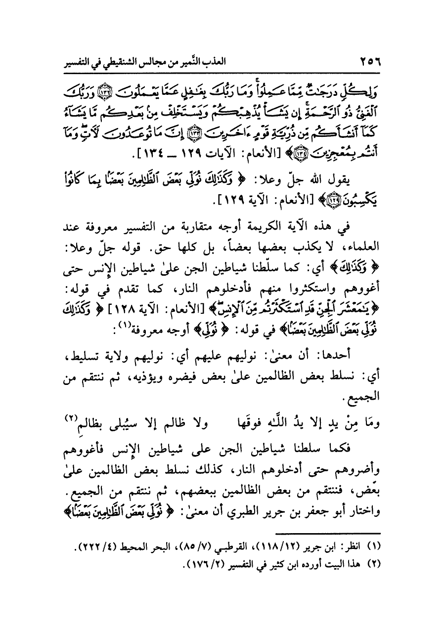 في هذه الآيةِ الكريمةِ أوجهٌ متقاربةٌ من التفسيرِ معروفةٌ عند العلماءِ، لا يُكَذِّبُ بعضُها بعضًا، بَلْ كُلُّهَا حَقٌّ. قولُه جل وعلا: {وَكَذَلِكَ} أي: كَمَا سَلَّطْنَا شياطينَ الجنِّ على شياطينِ الإنسِ حتى أَغْوَوْهُمْ واستكثروا منهم فَأَدْخَلُوهُمُ النَّارَ، كما تقدَّم في قولِه: {يَا مَعْشَرَ الْجِنِّ قَدِ اسْتَكْثَرْتُم مِّنَ الإِنْسِ} [الأنعام: الآية ١٢٨] {وَكَذَلِكَ نُوَلِّي بَعْضَ الظَّالِمِينَ بَعْضًا} في قولِه: {نُوَلِّي} أوجهٌ معروفةٌ (¬١):