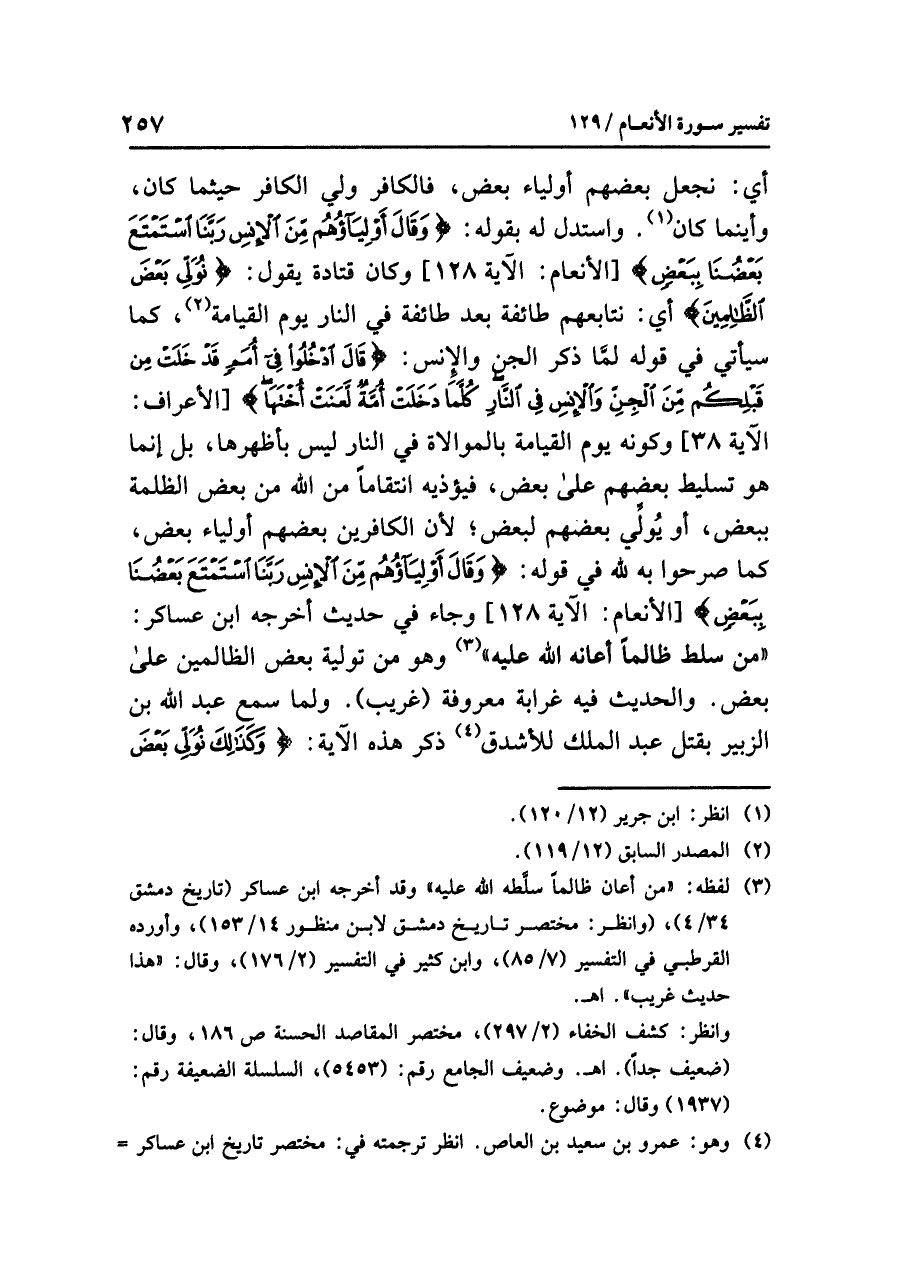 أي: نَجْعَلُ بعضَهم أولياءَ بعضٍ، فالكافرُ وَلِيُّ الكافرِ حيثما كَانَ، وَأَيْنَمَا كَانَ (¬١). واستدل له بقولِه: {وَقَالَ أَوْلِيَاؤُهُم مِّنَ الإِنْسِ رَبَّنَا اسْتَمْتَعَ بَعْضُنَا بِبَعْضٍ} [الأنعام: الآية ١٢٨] وكان قتادةُ يقولُ: {نُوَلِّي بَعْضَ الظَّالِمِينَ} أي: نُتَابِعُهُمْ طائفةً بعد طائفةٍ في النارِ يومَ القيامةِ (¬٢)، كما سيأتِي في قولِه لَمَّا ذَكَرَ الْجِنَّ والإنسَ: {قَالَ ادْخُلُوا فِي أُمَمٍ قَدْ خَلَتْ مِنْ قَبْلِكُم مِّنَ الْجِنِّ وَالإِنْسِ فِي النَّارِ كُلَّمَا دَخَلَتْ أُمَّةٌ لَّعَنَتْ أُخْتَهَا} [الأعراف: الآية ٣٨] وكونُه يومَ القيامةِ بالموالاةِ في النارِ ليس بأظهرِها، بل إنما هو تسليطُ بعضِهم على بعضٍ، فيؤذيه انْتِقَامًا من اللَّهِ من بعضِ الظلمةِ ببعضٍ، أو يُوَلِّي بعضَهم لبعضٍ؛ لأن الكافرينَ بعضُهم أولياءُ بعضٍ، كما صَرَّحُوا به لِلَّهِ في قولِه: {وَقَالَ أَوْلِيَاؤُهُم مِّنَ الإِنْسِ رَبَّنَا اسْتَمْتَعَ بَعْضُنَا بِبَعْضٍ} [الأنعام: الآية ١٢٨] وجاء في حديثٍ أخرجَه ابنُ عساكرَ: «مَنْ سَلَّطَ ظَالِمًا أَعَانَهُ اللَّهُ عَلَيْهِ» (¬٣) وهو من توليةِ بعضِ الظالمينَ على بعضٍ. وَالحديثُ فيه غرابةٌ معروفةٌ (غريبٌ).