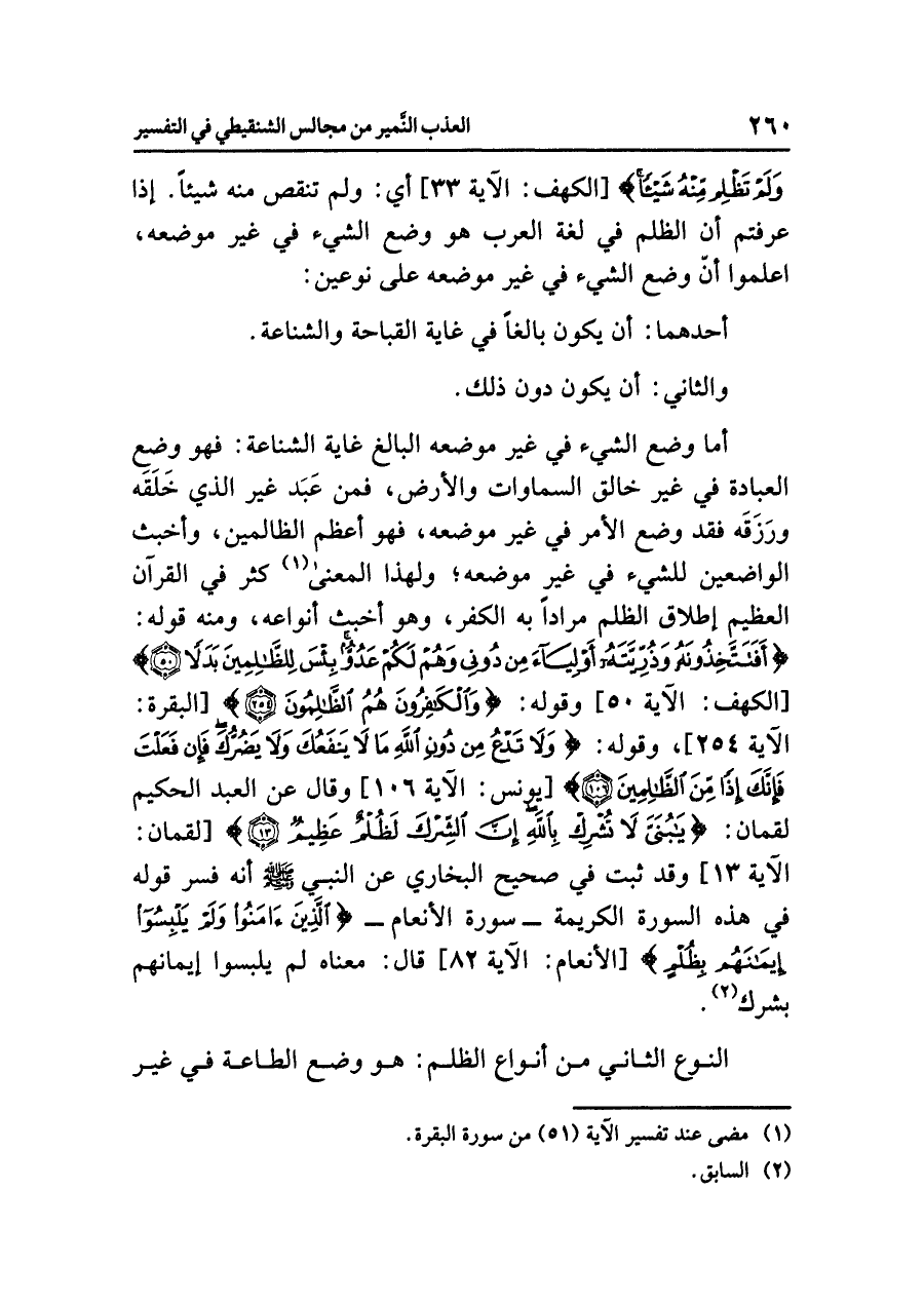 وَلَمْ تَظْلِمْ مِنْهُ شَيْئًا} [الكهف: الآية ٣٣] أي: ولم تَنْقُصْ منه شَيْئًا. إذا عَرَفْتُمْ أن الظلمَ في لغةِ العربِ هو وضعُ الشيءِ في غيرِ موضعِه، اعلموا أَنَّ وضعَ الشيءِ في غيرِ موضعِه على نَوْعَيْنِ: