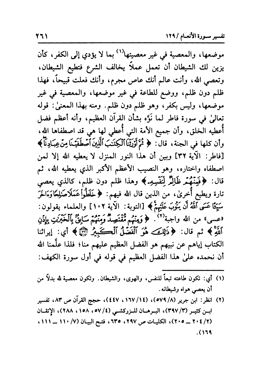 موضعِها، والمعصيةِ في غيرِ معصيتِها (¬١) بما لا يُؤَدِّي إلى الكفرِ، كَأَنْ يُزَيِّنَ لكَ الشيطانُ أن تعملَ عَمَلاً يُخَالِفُ الشرعَ فتطيعُ الشيطانَ، وتعصِي اللَّهَ، وأنتَ عَالِمٌ أَنَّكَ عاصٍ مُجْرِمٌ، وأنكَ فعلتَ قبيحًا، فهذا ظلمٌ دونَ ظلمٍ، ووضعٌ للطاعةِ في غيرِ موضعِها، والمعصيةِ في غيرِ موضعِها، وليسَ بِكُفْرٍ، وهو ظلمٌ دونَ ظلمٍ. ومنه بهذا المعنَى: قولُه تعالى في سورةِ (فاطر) لَمَّا نَوَّهَ بشأنِ القرآنِ العظيمِ، وأنه أعظمُ فضلٍ أُعْطِيهِ الخلق، وأن جميعَ الأمةِ التي أُعْطِيَ لها هي قد اصطفاها اللَّهُ، وأن كُلَّهَا في الجنةِ، قال: {ثُمَّ أَوْرَثْنَا الْكِتَابَ الَّذِينَ اصْطَفَيْنَا مِنْ عِبَادِنَا} [فاطر: الآية ٣٢] وَبَيَّنَ أن هذا النورَ الْمُنَزَّلَ لا يُعْطِيهِ اللَّهُ إلا لِمَنِ اصطفاهُ واختارهُ، وهو النصيبُ الأعظمُ الأكبرُ الذي يُعْطِيهِ اللَّهُ، ثم قال: {فَمِنْهُمْ ظَالِمٌ لِّنَفْسِهِ} وهذا ظلمٌ دونَ ظلمٍ، كالذي يَعْصِي تارةً ويطيعُ أخرى، مِنَ الذين قال اللَّهُ فيهم: {خَلَطُوا عَمَلاً صَالِحًا وَآخَرَ سَيِّئًا عَسَى اللَّهُ أَنْ يَتُوبَ عَلَيْهِمْ} [التوبة: الآية ١٠٢] والعلماءُ يقولونَ: «عسى» مِنَ اللَّهِ واجبةٌ (¬٢).