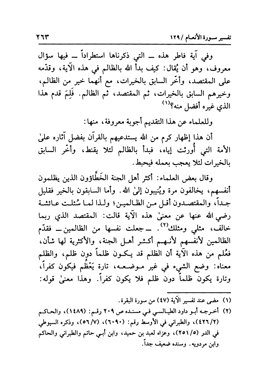 وفي آيةِ فاطر هذه- التي ذَكَرْنَاهَا استطرادًا- فيها سؤالٌ معروفٌ، وهو أن يُقَالَ: كيف بدأ اللَّهُ بالظالمِ في هذه الآيةِ، وَقَدَّمَهُ على المقتصدِ، وَأَخَّرَ السابقَ بالخيراتِ، مع أنهما خيرٌ من الظالمِ، وخيرُهم السابقُ بالخيراتِ، ثم المقتصدُ، ثم الظالمُ. فَلِمَ قَدَّمَ هذا الذي غيرُه أفضلُ منه (¬١)؟