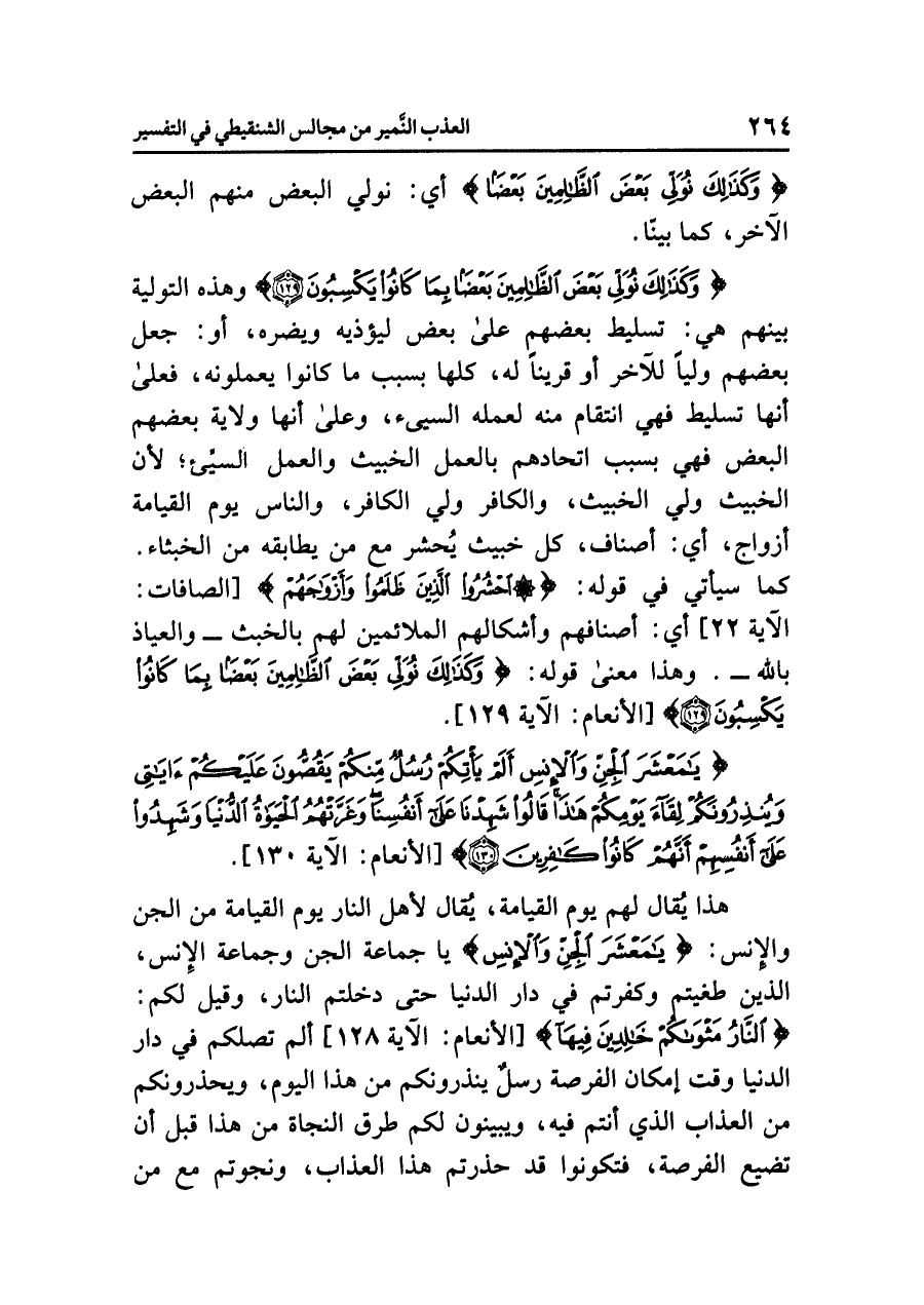 {وَكَذَلِكَ نُوَلِّي بَعْضَ الظَّالِمِينَ بَعْضًا بِمَا كَانُوا يَكْسِبُونَ (١٢٩)} وهذه التوليةُ بينَهم هي: تسليطُ بعضِهم على بعضٍ لِيُؤْذِيَهُ وَيَضُرَّهُ، أو: جعل بعضهم وَلِيًّا للآخَرِ أو قرينًا له، كُلُّهَا بسببِ ما كانوا يعملونَه، فعلى أنها تسليطٌ فهي انتقامٌ منه لعملِه السيئِ، وعلى أنها ولايةُ بعضِهم البعضَ فهي بسببِ اتحادِهم بالعملِ الخبيثِ والعملِ السيئِ؛ لأن الخبيثَ وَلِيُّ الخبيثِ، والكافرُ وَلِيُّ الكافرِ، والناسُ يومَ القيامةِ أزواجٌ، أي: أصنافٌ، كُلُّ خبيثٍ يُحْشَرُ مع من يُطَابِقُهُ من الخبثاءِ. كما سيأتِي في قولِه: {احْشُرُوا الَّذِينَ ظَلَمُوا وَأَزْوَاجَهُمْ} [الصافات: الآية ٢٢] أي: أَصْنَافَهُمْ وأشكالَهم الْمُلَائِمِينَ لهم بالخبثِ، والعياذُ بالله. وهذا معنَى قولِه: {وَكَذَلِكَ نُوَلِّي بَعْضَ الظَّالِمِينَ بَعْضًا بِمَا كَانُوا يَكْسِبُونَ (١٢٩)} [الأنعام: الآية ١٢٩].