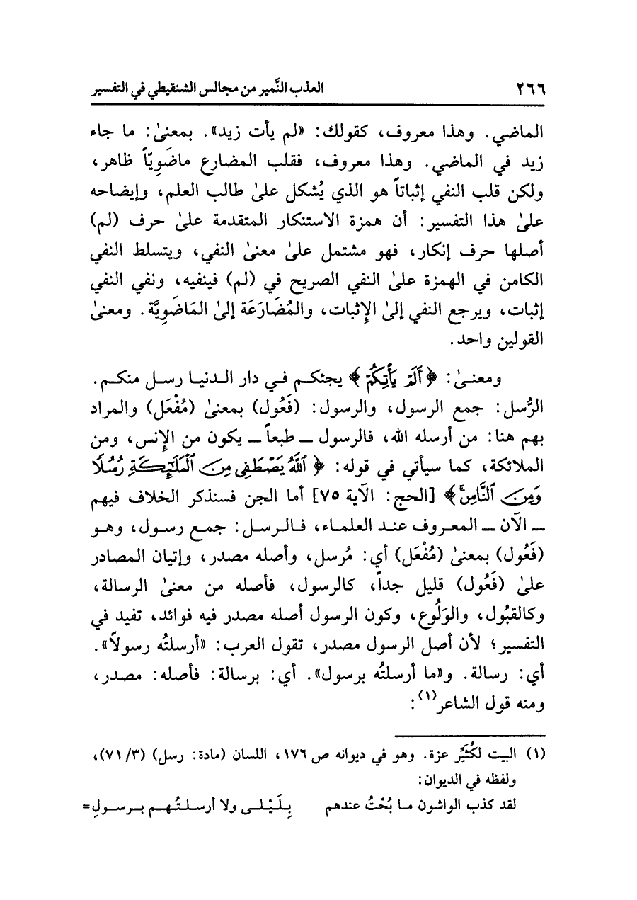 الماضِي. وهذا معروفٌ، كقولِك: «لم يأت زيد». بمعنَى: ما جاء زيدٌ في الماضِي. وهذا معروفٌ، فقلبُ المضارعِ ماضَوِيًّا ظَاهِرٌ، ولكن قلبَ النفيِ إثباتًا هو الذي يُشْكِلُ على طالبِ العلمِ، وإيضاحُه على هذا التفسيرِ: أن همزةَ الاستنكارِ المتقدمةَ على حرفِ (لم) أصلُها حرفُ إنكارٍ، فهو مشتملٌ على معنَى النفيِ، ويتسلطُ النفيُ الكامنُ في الهمزةِ على النفيِ الصريحِ في (لم) فَيَنْفِيهِ، ونفيُ النفيِ إثباتٌ، ويرجعُ النفيُ إلى الإثباتِ، والمُضَارَعَةُ إلى المَاضَوِيَّةِ. ومعنَى الْقَوْلَيْنِ وَاحِدٌ.