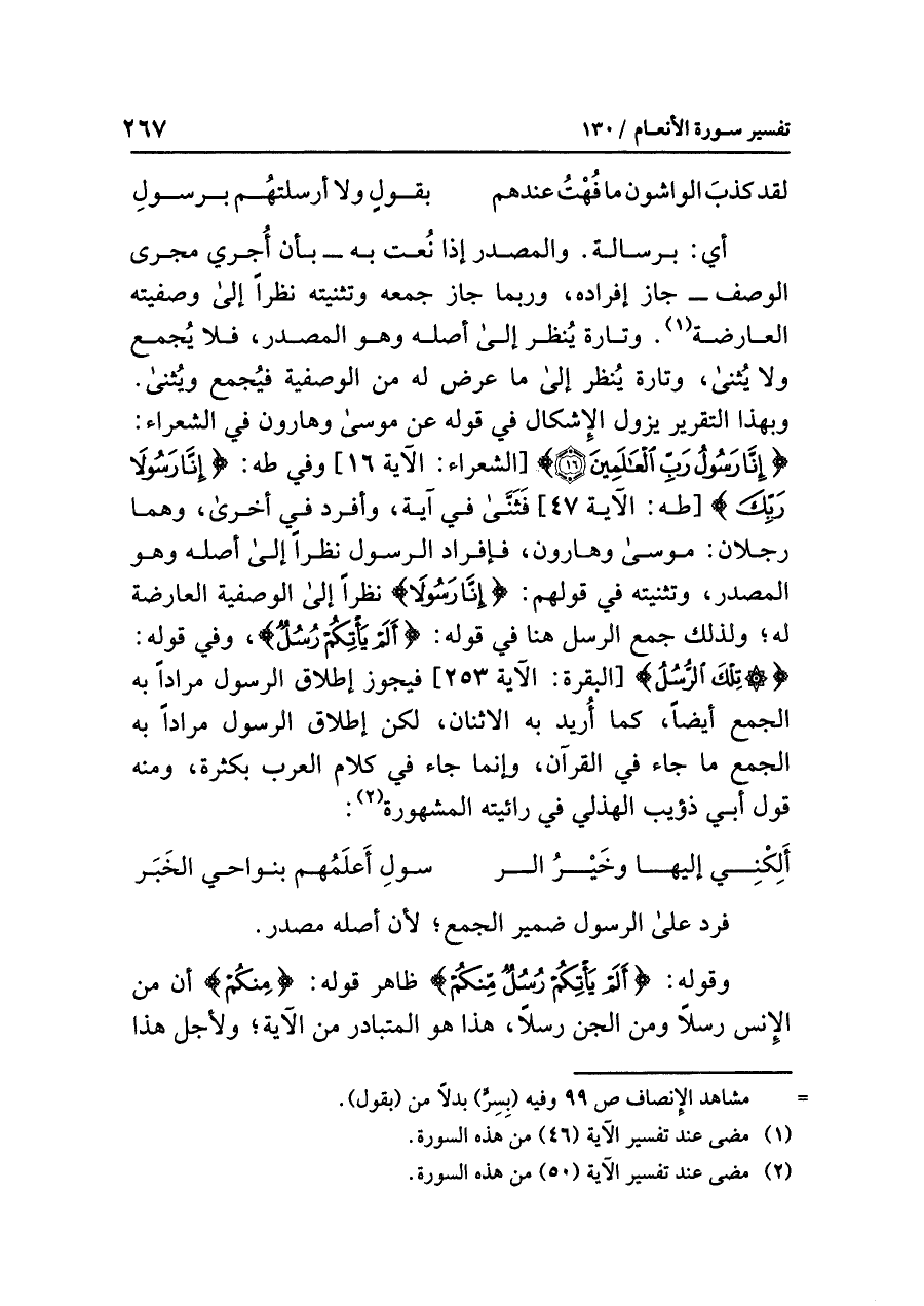 وبهذا التقريرِ يزولُ الإشكالُ في قولِه عن موسى وهارونَ في (الشعراءِ): {إِنَّا رَسُولُ رَبِّ الْعَالَمِينَ (١٦)} [الشعراء: الآية ١٦] وفي (طه): {إِنَّا رَسُولَا رَبِّكَ} [طه: الآية ٤٧] فَثَنَّى في آيةٍ، وَأَفْرَدَ في أُخْرَى، وهما رَجُلَانِ: موسَى وهارونُ، فإفرادُ الرسولِ نظرًا إلى أصلِه وهو المصدرُ، وتثنيتُه في قولِهم: {إِنَّا رَسُولَا} نظرًا إلى الوصفيةِ العارضةِ له؛ ولذلك جَمَعَ الرسلَ هنا في قولِه: {أَلَمْ يَأْتِكُمْ رُسُلٌ} وفي قولِه: {تِلْكَ الرُّسُلُ} [البقرة: الآية ٢٥٣] فيجوزُ إطلاقُ الرسولِ مرادًا به الجمعُ أيضا، كما أُرِيدَ به الاثنانِ، لكن إطلاقَ الرسولِ مُرَادًا به الجمعُ ما جاءَ في القرآنِ، وإنما جاءَ في كلامِ العربِ بكثرةٍ، ومنه قولُ أبِي ذؤيبٍ الهذليِّ في رائيتِه المشهورةِ (¬٢):