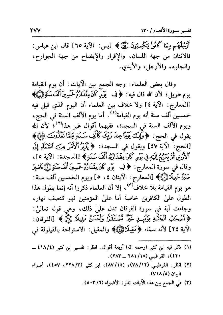 وقال بعضُ العلماءِ: وجهُ الجمعِ بينَ الآياتِ: أن يومَ القيامةِ يومٌ طويلٌ؛ لأَنَّ اللَّهَ قال فيه: {فِي يَوْمٍ كَانَ مِقْدَارُهُ خَمْسِينَ أَلْفَ سَنَةٍ (٤)} [المعارج: الآية ٤] ولا خلافَ بينَ العلماءِ أن اليومَ الذي قيلَ فيه خمسينَ ألفَ سنةٍ أنه يومُ القيامةِ (¬١). أما يومُ الألفِ السنةِ في (الحجِّ) ويومُ الألفِ السنةِ في (السجدةِ) ففيهما أقوالٌ غيرُ هذا (¬٢)؛ لأن اللَّهَ يقولُ في الحجِّ: {وَإِنَّ يَوْمًا عِنْدَ رَبِّكَ كَأَلْفِ سَنَةٍ مِّمَّا تَعُدُّونَ (٤٧)} [الحج: الآية ٤٧] ويقولُ في السجدةِ: {يُدَبِّرُ الْأَمْرَ مِنَ السَّمَاءِ إِلَى الْأَرْضِ ثُمَّ يَعْرُجُ إِلَيْهِ فِي يَوْمٍ كَانَ مِقْدَارُهُ أَلْفَ سَنَةٍ} [السجدة: الآية ٥] وقال في سورةِ المعارجِ: {فِي يَوْمٍ كَانَ مِقْدَارُهُ خَمْسِينَ أَلْفَ سَنَةٍ (٤) فَاصْبِرْ صَبْرًا جَمِيلاً (٥)} [المعارج: الآيتان ٤، ٥] ويوم الخمسين ألف سنةً: هو يومُ القيامةِ بلَا خلافٍ (¬٣)، إلا أن العلماءَ ذَكَرُوا أنه إنما يطولُ هذا الطولَ على الكافرينَ خاصةً، أَمَّا على المؤمنينَ فهو كنصفِ نهارٍ، وجاءت آيةٌ في سورةِ الفرقانِ تدلُّ على ذلك، وهي قولُه تعالى: {أَصْحَابُ الْجَنَّةِ يَوْمَئِذٍ خَيْرٌ مُّسْتَقَرًّا وَأَحْسَنُ مَقِيلاً} [الفرقان: الآية ٢٤] لأنه سَمَّاهُ {مَقِيلاً} والمقيلُ: الاستراحةُ بالقيلولةِ في