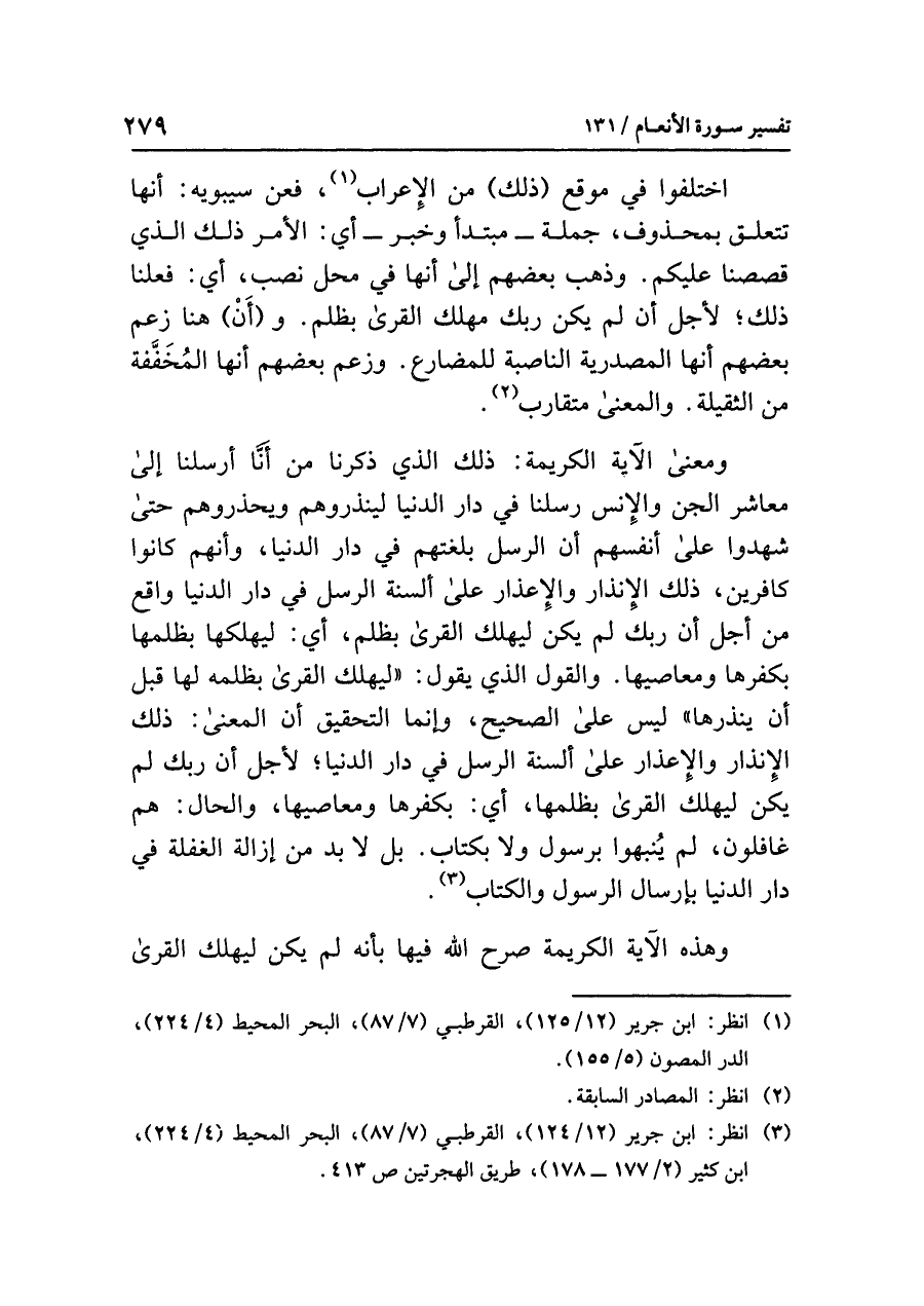 والقولُ الذي يقولُ: «لِيُهْلِكَ الْقُرَى بِظُلْمِهِ لَهَا قَبْلَ أَنْ يُنْذِرَهَا» ليسَ على الصحيحِ، وإنما التحقيقُ أن المعنَى: ذلك الإنذارُ والإعذارُ على ألسنةِ الرسلِ في دارِ الدنيا؛ لأَجْلِ أن رَبَّكَ لم يكن لِيُهْلِكَ القرى بِظُلْمِهَا، أي: بِكُفْرِهَا ومعاصيها، والحالُ: هُمْ غَافِلُونَ، لم يُنَبَّهُوا برسولٍ ولا بكتابٍ. بل لابد من إزالةِ الغفلةِ في دارِ الدنيا بإرسالِ الرسولِ والكتابِ (¬٣).