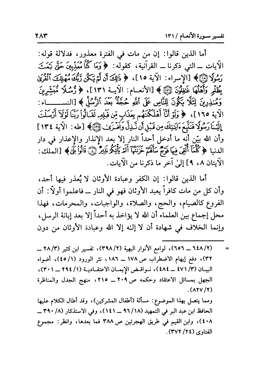 أما الذين قالوا: إن الكفرَ وعبادةَ الأوثانِ لا يُعْذَرُ فيها أحدٌ، وأن كُلَّ مَنْ ماتَ كَافِرًا يعبدُ الأوثانَ فهو في النارِ - فَاعْلَمُوا أَوَّلاً: أن الفروعَ كالصيامِ والحجِّ والصلاةِ والواجباتِ والمحرماتِ فهذا محلُّ إجماعٍ بين العلماءِ أن اللَّهَ لَا يُؤَاخِذُ به أَحَدًا إلا بعدَ إبانةِ الرسلِ، وإنما الخلافُ فِي شهادةِ أن لا إلهَ إِلَاّ اللَّهُ وعبادةِ الأوثانِ من دُونِ