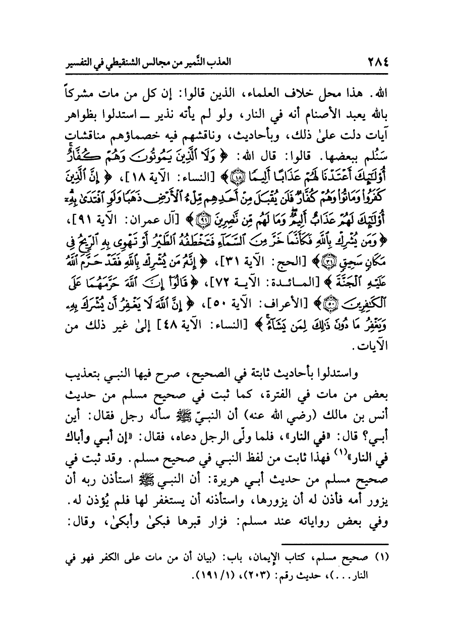اللَّهِ. هذا محلُّ خلافِ العلماءِ، الذين قالوا: إِنَّ كُلَّ مَنْ مَاتَ مُشْرِكًا بِاللَّهِ يعبدُ الأصنامَ أنه في النارِ، ولو لم يَأْتِهِ نذيرٌ - استدلوا بظواهرِ آياتٍ دَلَّتْ على ذلك وبأحاديثَ، وَنَاقَشَهُمْ فيه خصماؤهم مناقشاتٍ سَنُلِمُّ ببعضِها. قالوا: قال اللَّهُ: {وَلَا الَّذِينَ يَمُوتُونَ وَهُمْ كُفَّارٌ أُولَئِكَ أَعْتَدْنَا لَهُمْ عَذَابًا أَلِيمًا (١٨)} [النساء: الآية ١٨] {إِنَّ الَّذِينَ كَفَرُوا وَمَاتُوا وَهُمْ كُفَّارٌ فَلَنْ يُقْبَلَ مِنْ أَحَدِهِم مِّلْءُ الأرْضِ ذَهَبًا وَلَوِ افْتَدَى بِهِ أُولَئِكَ لَهُمْ عَذَابٌ أَلِيمٌ وَمَا لَهُم مِّن نَّاصِرِينَ (٩١)} [آل عمران: الآية ٩١] {وَمَنْ يُشْرِكْ بِاللَّهِ فَكَأَنَّمَا خَرَّ مِنَ السَّمَاءِ فَتَخْطَفُهُ الطَّيْرُ أَوْ تَهْوِي بِهِ الرِّيحُ فِي مَكَانٍ سَحِيقٍ} [الحج: الآية ٣١] {إِنَّهُ مَنْ يُشْرِكْ بِاللَّهِ فَقَدْ حَرَّمَ اللَّهُ عَلَيهِ الْجَنَّةَ} [المائدة: الآية ٧٢] {قَالُوا إِنَّ اللَّهَ حَرَّمَهُمَا عَلَى الْكَافِرِينَ (٥٠)} [الأعراف: الآية ٥٠] {إِنَّ اللَّهَ لَا يَغْفِرُ أَنْ يُشْرَكَ بِهِ وَيَغْفِرُ مَا دُونَ ذَلِكَ لِمَنْ يَشَاءُ} [النساء: الآية ٤٨] إلى غيرِ ذلك من الآياتِ.