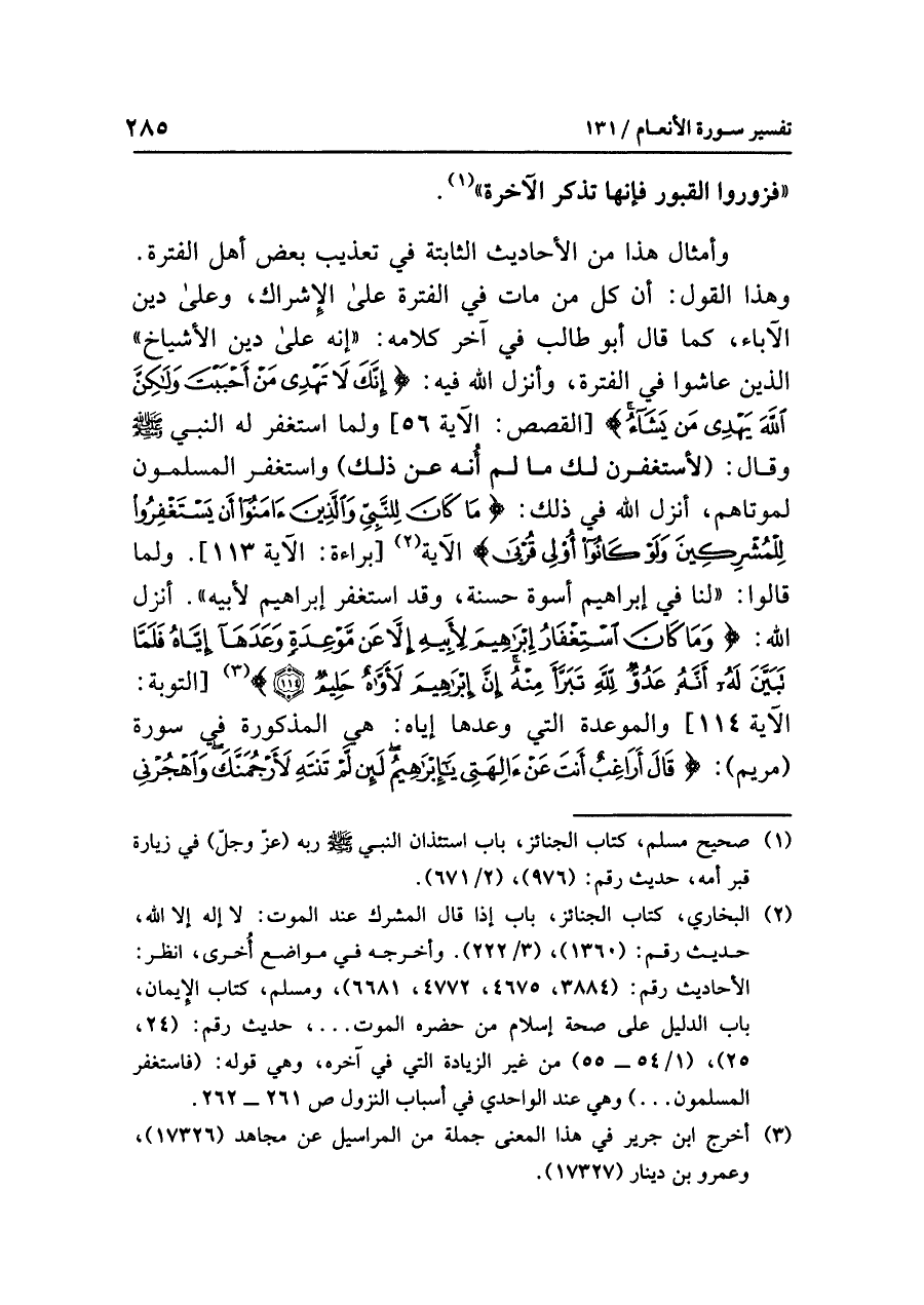 وأمثالُ هذا من الأحاديثِ الثابتةِ في تعذيبِ بعضِ أهلِ الفترةِ. وهذا القولُ: أَنَّ كُلَّ مَنْ مَاتَ في الفترةِ على الإشراكِ، وعلى دِينِ الآباءِ، كما قال أبو طالبٍ في آخِرِ كَلَامِهِ: «إنه على دِينِ الأشياخِ» الذين عَاشُوا في الفترةِ، وأنزلَ اللَّهُ فيه: {إِنَّكَ لَا تَهْدِي مَنْ أَحْبَبْتَ وَلَكِنَّ اللَّهَ يَهْدِي مَنْ يَشَاءُ} [القصص: الآية ٥٦] وَلَمَّا استغفرَ له النبيُّ - صلى الله عليه وسلم - وقال: (لأَسْتَغْفِرَنَّ لَكَ مَا لَمْ أُنْهَ عَنْ ذَلِكَ) واستغفرَ المسلمون لِمَوْتَاهُمْ، أَنْزَلَ اللَّهُ في ذلك: {مَا كَانَ لِلنَّبِيِّ وَالَّذِينَ آمَنُوا أَنْ يَسْتَغْفِرُوا لِلْمُشْرِكِينَ وَلَوْ كَانُوا أُولِي قُرْبَى} الآية (¬٢) [براءة: الآية ١١٣]. وَلَمَّا قالوا: «لَنَا فِي إبراهيمَ أسوةٌ حسنةٌ، وقد استغفرَ إبراهيمُ لأبيه». أنزلَ اللَّهُ: {وَمَا كَانَ اسْتِغْفَارُ إِبْرَاهِيمَ لِأَبِيهِ إِلَاّ عَن مَّوْعِدَةٍ وَعَدَهَا إِيَّاهُ فَلَمَّا تَبَيَّنَ لَهُ أَنَّهُ عَدُوٌّ لِلَّهِ تَبَرَّأَ مِنْهُ إِنَّ إِبْرَاهِيمَ لأَوَّاهٌ حَلِيمٌ (١١٤)} (¬٣)