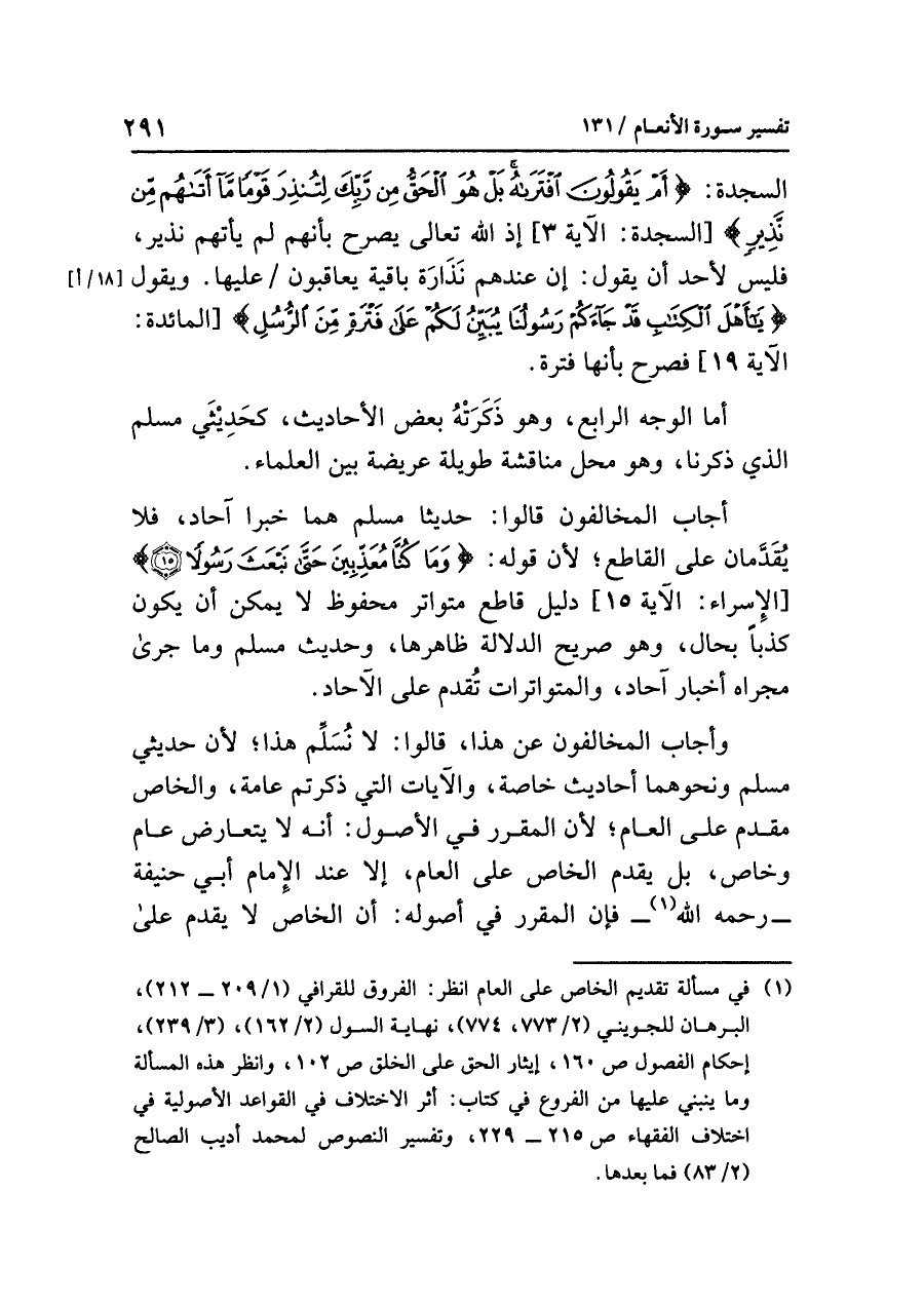 (¬١) في مسألة تقديم الخاص على العام انظر: الفروق للقرافي (١/ ٢٠٩ - ٢١٢)، البرهان للجويني (٢/ ٧٧٣، ٧٧٤)، نهاية السول (٢/ ١٦٢)، (٣/ ٢٣٩)، إحكام الفصول ١٦٠، إيثار الحق على الخلق ١٠٢. وانظر هذه المسألة وما ينبني عليها من الفروع في كتاب: أثر الاختلاف في القواعد الأصولية في اختلاف الفقهاء ص ٢١٥ - ٢٢٩، وتفسير النصوص لمحمد أديب الصالح (٢/ ٨٣) فما بعدها.