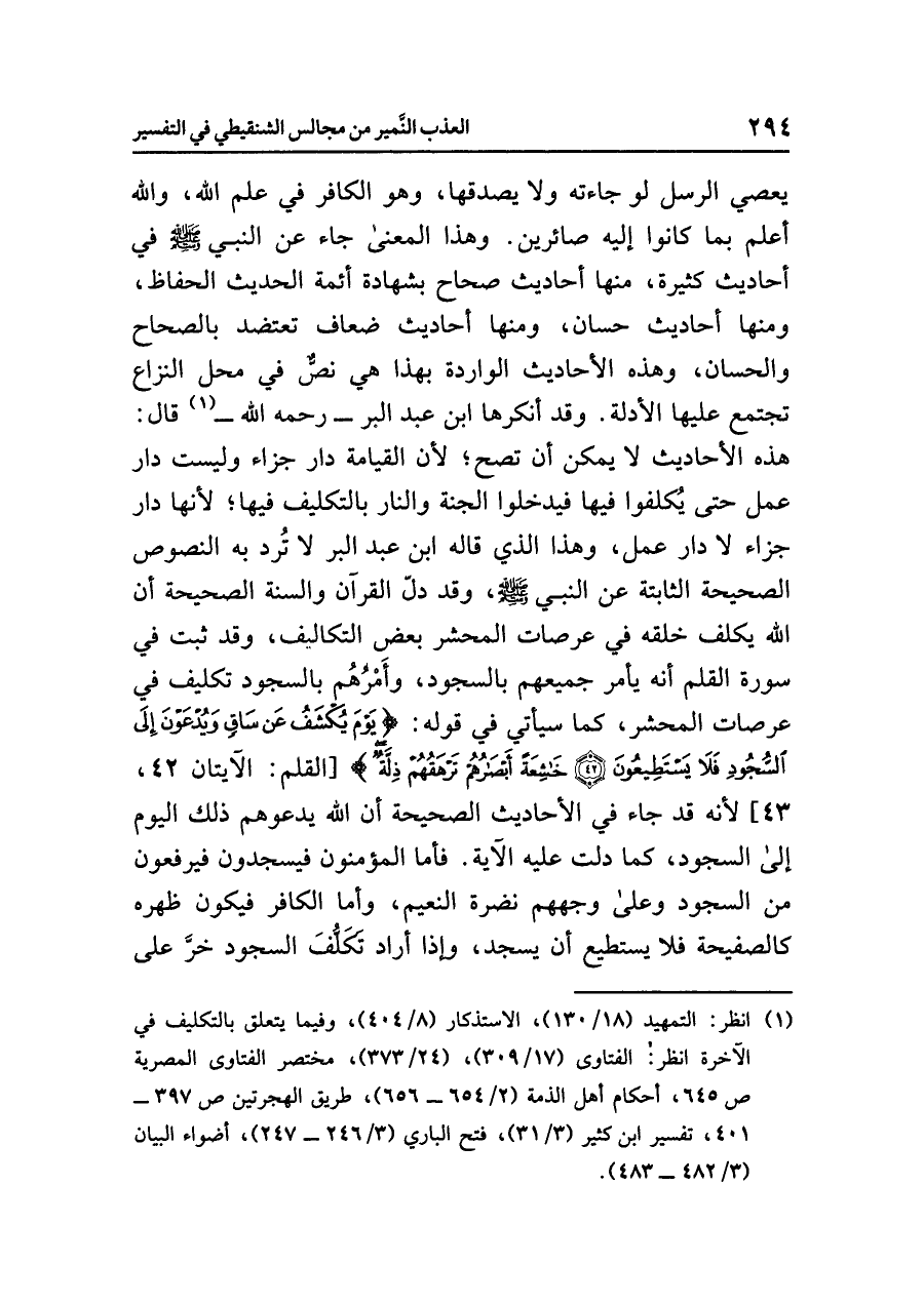 يَعْصِي الرسلَ لو جَاءَتْهُ ولَا يُصَدِّقُهَا، وهو الكافرُ في عِلْمِ اللَّهِ، وَاللَّهُ أَعْلَمُ بما كَانُوا إليه صَائِرِينَ. وهذا المعنَى جَاءَ عن النبيِّ - صلى الله عليه وسلم - في أحاديثَ كثيرةٍ، منها أحاديثُ صحاحٌ بشهادةِ أئمةِ الحديثِ الْحُفَّاظِ، ومنها أحاديثُ حِسَانٌ، ومنها أحاديثُ ضعافٌ تَعْتَضِدُ بالصحاحِ وَالْحِسَانِ، وهذه الأحاديثُ الواردةُ بهذا هي نَصٌّ في مَحَلِّ النزاعِ تجتمعُ عليها الأدلةُ. وقد أَنْكَرَهَا ابنُ عبدِ البرِّ - رحمه الله (٢) - قال: هذه الأحاديثُ لَا يمكنُ أن تَصِحَّ؛ لأن القيامةَ دارُ جزاءٍ وليست دارَ عملٍ حتى يُكَلَّفُوا فيها فيدخلوا الجنةَ والنارَ بالتكليفِ فيها؛ لأنها دارُ جزاءٍ لا دارَ عملٍ، وهذا الذي قَالَهُ ابنُ عبدِ البرِّ لَا تُرَدُّ به النصوصُ الصحيحةُ الثابتةُ عن النبيِّ - صلى الله عليه وسلم -، وقد دَلَّ القرآنُ والسنةُ الصحيحةُ أن اللَّهَ يكلفُ خلقَه في عرصاتِ المحشرِ بعضَ التكاليفِ، وقد ثَبَتَ في سورةِ القلمِ أنه يَأْمُرُ جميعَهم بالسجودِ، وأَمْرُهُمْ بالسجودِ تكليفٌ في عرصاتِ المحشرِ، كما سيأتِي فيِ قولِه: {يَوْمَ يُكْشَفُ عَنْ سَاقٍ وَيُدْعَوْنَ إِلَى السُّجُودِ فَلَا يَسْتَطِيعُونَ (٤٢) خَاشِعَةً أَبْصَارُهُمْ تَرْهَقُهُمْ ذِلَّةٌ} [القلم: الآيتان ٤٢، ٤٣] لأنه قد جاءَ في الأحاديثِ الصحيحةِ أن اللَّهَ يدعوهم ذلك اليومَ إلى السجودِ، كما دَلَّتْ عليه الآيةُ.