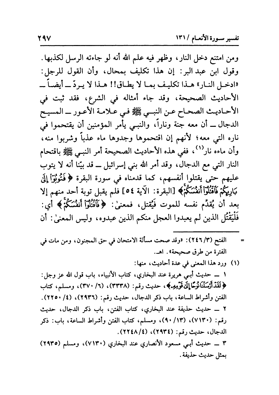وَمَنِ امتنعَ دخلَ النارَ، وظهرَ فيه عِلْمُ اللَّهِ أنه لو جاءته الرسلُ لَكَذَّبَهَا. وقولُ ابنِ عبدِ البرِّ: إن هذا تكليفٌ بِمُحَالٍ، وأن القولَ للرجلِ: «ادْخُلِ النَّارَ» هذا تكليفٌ بما لا يطاقُ!! هذا لا يَرُدُّ - أيضا - الأحاديثَ الصحيحةَ، وقد جاء أمثالُه في الشرعِ، فقد ثَبَتَ في الأحاديثِ الصحاحِ عن النبيِّ - صلى الله عليه وسلم - في علامةِ الأعورِ - المسيحِ الدجالِ - أن معه جنةً ونارًا، والنبيُّ يأمرُ المؤمنين أن يقتحموا في نارِه التي معه؛ لأنهم إن اقتحموها وجدوها ماءً عذبًا وَشَرِبُوا منه، وأن ماءَه نارٌ (¬١)،