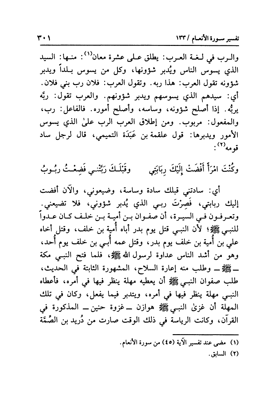 والربُّ في لغةِ العربِ: يُطْلَقُ على عشرةِ مَعَانٍ (¬١): منها: السيدُ الذي يَسُوسُ الناسَ ويُدَبِّرُ شؤونَها، وكلُّ مَنْ يسوسُ بلدًا ويدبرُ شؤونَه تقولُ العربُ: هذا رَبُّهُ. وتقول العربُ: فلانٌ رَبُّ بَنِي فُلَانٍ. أي: سيدُهم الذي يَسُوسُهُمْ ويدبرُ شؤونَهم. والعربُ تقولُ: ربَّه يربُّه. إذا أَصْلَحَ شؤونَه وَسَاسَهُ وَأَصْلَحَ أمورَه. فالفاعلُ: رَبٌّ، والمفعولُ: مربوبٌ. وَمِنْ إطلاقِ العربِ الربَّ على الذي يَسُوسُ الأمورَ وَيُدَبِّرُهَا: قولُ علقمةَ بنِ عَبَدَة التميميِّ، قال لرجلٍ سَادَ قَوْمَهُ (¬٢):