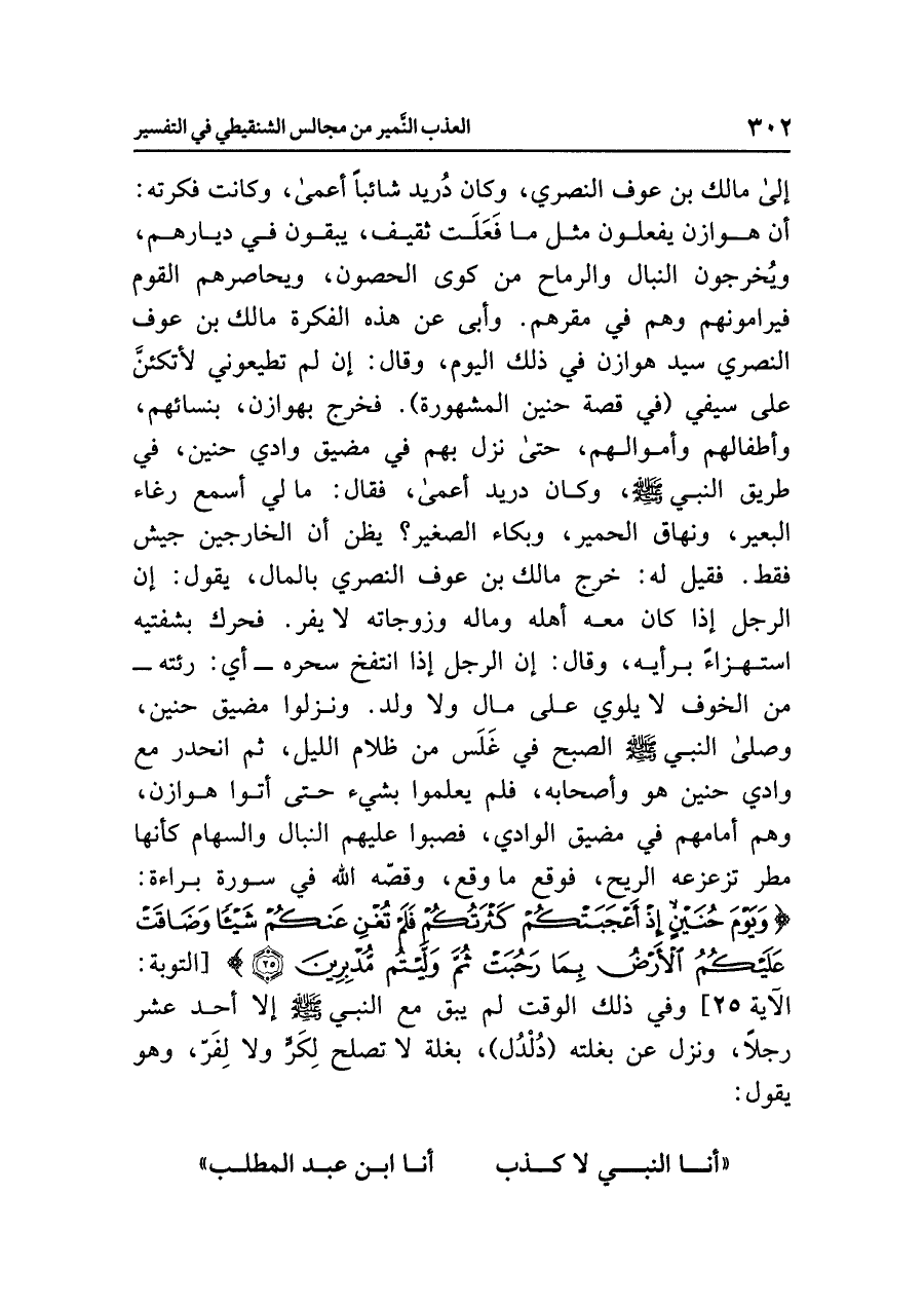 ونزلوا مضيقَ حنينٍ، وصلَّى النبيُّ - صلى الله عليه وسلم - الصبحَ في غَلَسٍ من ظلامِ الليلِ، ثم انحدرَ مع وادي حنينٍ هو وأصحابُه، فلم يعلموا بشيءٍ حتى أَتَوْا هوازنَ، وهم أمامَهم في مضيقِ الوادِي، فَصَبُّوا عليهم النبالَ والسهامَ كأنها مطرٌ تُزَعْزِعُهُ الريحُ، فَوَقَعَ ما وَقَعَ، وقصَّه اللَّهُ في سورةِ براءة: {وَيَوْمَ حُنَيْنٍ إِذْ أَعْجَبَتْكُمْ كَثْرَتُكُمْ فَلَمْ تُغْنِ عَنْكُمْ شَيْئًا وَضَاقَتْ عَلَيْكُمُ الأَرْضُ بِمَا رَحُبَتْ ثُمَّ وَلَّيْتُم مُّدْبِرِينَ} [التوبة: الآية ٢٥] وفي ذلك الوقتِ لم يَبْقَ مع النبيِّ - صلى الله عليه وسلم - إلا أَحَدَ عَشَرَ رَجُلاً، وَنَزَلَ عن بغلتِه (دُلْدُل)، بغلة لا تصلحُ لِكَرٍّ ولا لِفَرٍّ، وهو يقولُ: