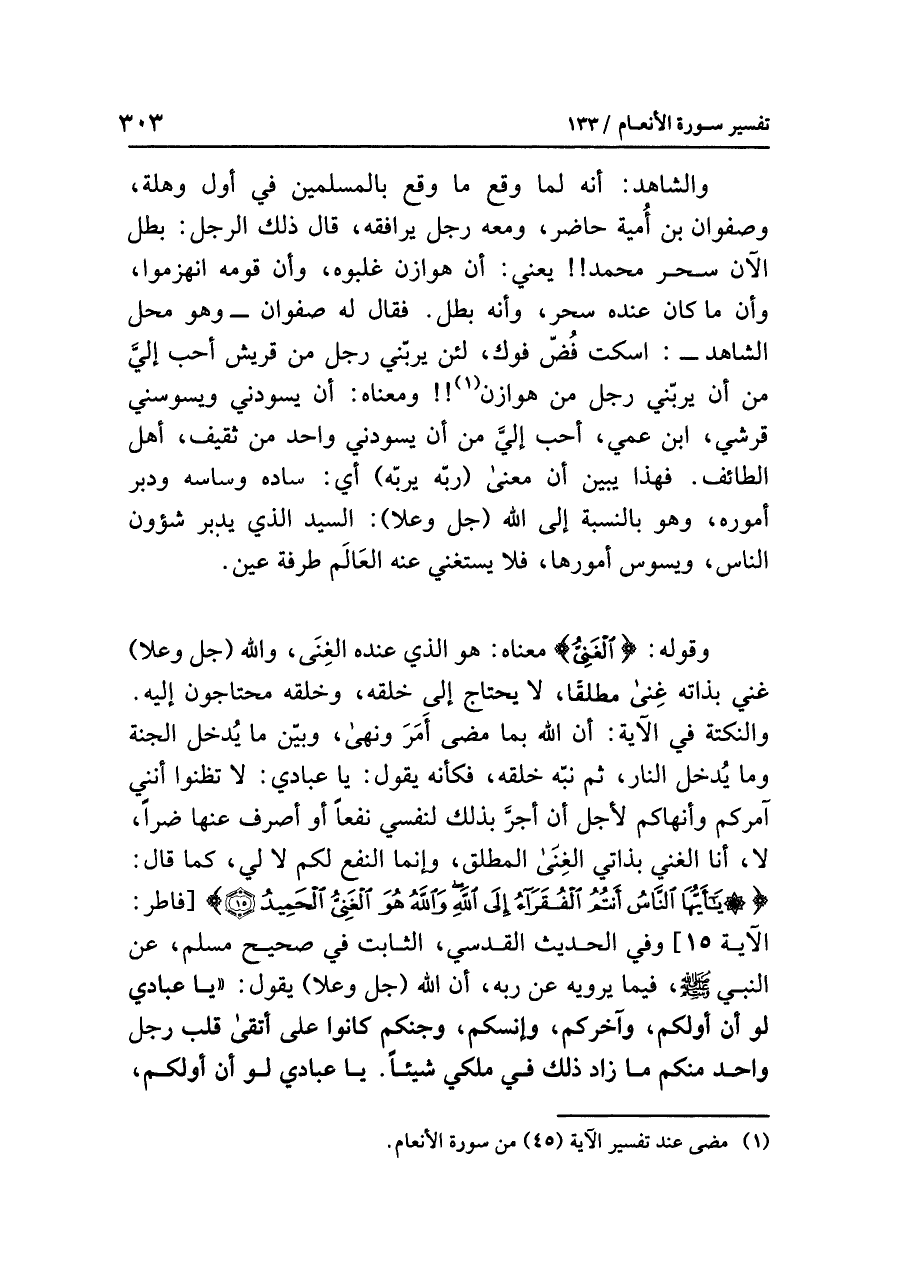 قولُه: {الْغَنِيُّ} معناه: هو الذي عنده الغِنَى، واللَّهُ (جل وعلا) غَنِيٌّ بذاتِه غِنًى مُطْلَقًا، لا يحتاج إلى خَلْقِهِ، وخلقُه محتاجونَ إليه. والنكتةُ في الآيةِ: أن اللَّهَ بما مَضَى أَمَرَ وَنَهَى، وَبَيَّنَ ما يُدْخِلُ الجنةَ وما يُدْخِلُ النارَ، ثم نَبَّهَ خلقَه، فكأنه يقولُ: يا عبادي: لا تَظُنُّوا أنني آمُرُكُمْ وَأَنْهَاكُمْ لأَجْلِ أن أَجُرَّ بذلك لنفسِي نفعًا أو أصرفَ عنها ضُرًّا، لا، أنا الغنيُّ بذاتِي الغِنَى المطلق، وإنما النفعُ لكم لا لِي، كما قال: {يَا أَيُّهَا النَّاسُ أَنْتُمُ الْفُقَرَاءُ إِلَى اللَّهِ وَاللَّهُ هُوَ الْغَنِيُّ الْحَمِيدُ} [فاطر: الآية ١٥] وفي الحديثِ القدسيِّ، الثابتِ في صحيحِ مسلمٍ، عن النبيِّ - صلى الله عليه وسلم -، فيما يَرْوِيهِ عن رَبِّهِ، أن اللَّهَ (جل وعلا) يقولُ: «يَا عِبَادِي لَوْ أَنَّ أَوَّلَكُمْ وَآخِرَكُمْ وَإِنْسَكُمْ وَجِنَّكُمْ كَانُوا عَلَى أَتْقَى قَلْبِ رَجُلٍ وَاحِدٍ مِنْكُمْ مَا زَادَ ذَلِكَ فِي مُلْكِي شَيْئًا. يَا عِبَادِي لَوْ أَنَّ أَوَّلَكُمْ