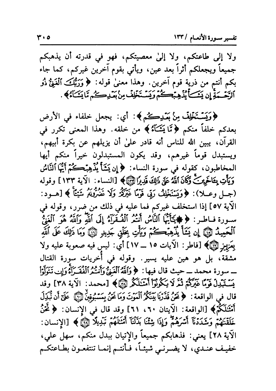 {وَيَسْتَخْلِفْ مِنْ بَعْدِكُمْ}: أي: يَجْعَلْ خلفاءَ فِي الأرضِ بعدَكم خَلَفًا منكم {مَّا يَشَاءُ} من خَلْقِهِ. وهذا المعنَى تَكَرَّرَ في القرآنِ، يُبَيِّنُ اللَّهُ للناسِ أنه قادرٌ على أن يزيلَهم عن بكرةِ أبيهم، ويستبدلَ قومًا غيرَهم، وقد يكونُ المستبدلونَ خيرًا منكم أيها المخاطَبونَ، كقولِه في سورةِ النساءِ: {إِنْ يَشَأْ يُذْهِبْكُمْ أَيُّهَا النَّاسُ وَيَأْتِ بِآخَرِينَ وَكَانَ اللَّهُ عَلَى ذَلِكَ قَدِيرًا} [النساء: الآية ١٣٣] وقولُه (جل وعلا): {وَيَسْتَخْلِفُ رَبِّي قَوْمًا غَيْرَكُمْ وَلَا تَضُرُّونَهُ شَيْئًا} [هود: الآية ٥٧] إذا استخلفَ غيرَكم فما عليه في ذلك مِنْ ضَرَرٍ، وقولُه في سورةِ فاطرٍ: {يَا أَيُّهَا النَّاسُ أَنْتُمُ الْفُقَرَاءُ إِلَى اللَّهِ وَاللَّهُ هُوَ الْغَنِيُّ الْحَمِيدُ (١٥) إِنْ يَشَأْ يُذْهِبْكُمْ وَيَأْتِ بِخَلْقٍ جَدِيدٍ (١٦) وَمَا ذَلِكَ عَلَى اللَّهِ بِعَزِيزٍ (١٧)} [فاطر: الآيات ١٥ - ١٧] أي: ليس فيه صعوبةٌ عليه ولا مشقةٌ، بل هو هَيِّنٌ عليه يَسِيرٌ. وقولُه في أُخْرَيَاتِ سورةِ القتالِ - سورةِ محمدٍ - حيث قال فيها: {وَاللَّهُ الْغَنِيُّ وَأَنْتُمُ الْفُقَرَاءُ وَإِنْ تَتَوَلَّوْا يَسْتَبْدِلْ قَوْمًا غَيْرَكُمْ ثُمَّ لَا يَكُونُوا أَمْثَالَكُمْ} [محمد: الآية ٣٨] وقد قال في الواقعةِ: {نَحْنُ قَدَّرْنَا بَيْنَكُمُ الْمَوْتَ وَمَا نَحْنُ بِمَسْبُوقِينَ (٦٠) عَلَى أَنْ نُبَدِّلَ أَمْثَالَكُمْ} [الواقعة: الآيتان ٦٠، ٦١] وقد قال في الإنسانِ: {نَحْنُ خَلَقْنَاهُمْ وَشَدَدْنَا أَسْرَهُمْ وَإِذَا شِئْنَا بَدَّلْنَا أَمْثَالَهُمْ تَبْدِيلاً} [الإنسان: الآية ٢٨] يعني: فَذَهَابُكُمْ جميعًا والإتيانُ ببدلٍ منكم، سهلٌ عَلَيَّ، خفيفٌ عندي، لا يضرُّني شيئًا، فأنتم إنما تنتفعونَ بطاعتِكم