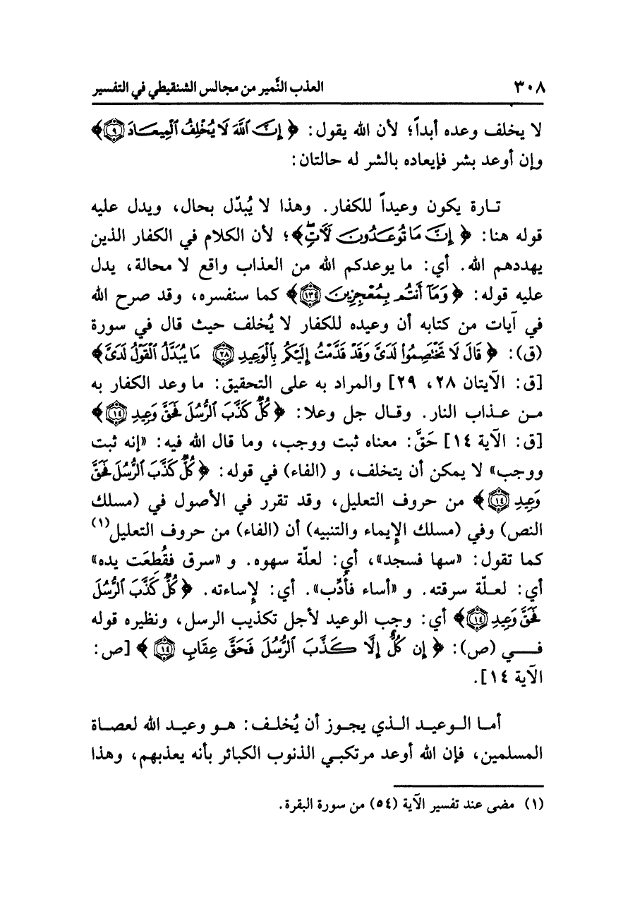 تَارَةً يكونُ وعيدًا للكفارِ. وهذا لا يُبَدَّلُ بحالٍ، ويدلُّ عليه قولُه هنا: {إِنَّ مَا تُوعَدُونَ لآتٍ}؛ لأن الكلامَ في الكفارِ الذين يهددُهم اللَّهُ. أي: ما يُوعِدُكُمُ اللَّهُ من العذابِ وَاقِعٌ لَا محالةَ، يدلُّ عليه قولُه: {وَمَا أَنْتُمْ بِمُعْجِزِينَ} كما سَنُفَسِّرُهُ، وقد صَرَّحَ اللَّهُ في آياتٍ من كتابِه أن وعيدَه للكفارِ لَا يُخْلَفُ حيث قال فِي سورةِ (ق): {قَالَ لَا تَخْتَصِمُوا لَدَيَّ وَقَدْ قَدَّمْتُ إِلَيْكُم بِالْوَعِيدِ (٢٨) مَا يُبَدَّلُ الْقَوْلُ لَدَيَّ} [ق: الآيتان ٢٨، ٢٩] والمرادُ به على التحقيقِ: ما وُعِدَ الكفارُ به من عذابِ النارِ. وقال جل وعلا: {كُلٌّ كَذَّبَ الرُّسُلَ فَحَقَّ وَعِيدِ} [ق: الآية ١٤] حَقَّ: معناه ثَبَتَ وَوَجَبَ، وما قال اللَّهُ فيه: «إِنَّهُ ثَبَتَ وَوَجَبَ» لا يمكنُ أن يتخلفَ، و (الفاءُ) في قولِه: {كُلٌّ كَذَّبَ الرُّسُلَ فَحَقَّ وَعِيدِ} من حروفِ التعليلِ، وقد تقررَ في الأصولِ في (مسلكِ النصِّ) وفي (مسلكِ الإيماءِ والتنبيهِ) أن (الفاءَ) من حروفِ التعليلِ (¬١) كما تقولُ: «سَهَا فَسَجَدَ»، أي: لِعِلَّةِ سَهْوِهِ. و «سَرَقَ فَقُطِعَتْ يَدُهُ» أي: لِعِلَّةِ سرقتِه. و «أَسَاءَ فَأُدِّبَ». أي: لإساءتِه. {كُلٌّ كَذَّبَ الرُّسُلَ فَحَقَّ وَعِيدِ} أي: وَجَبَ الوعيدُ لأجلِ تكذيبِ الرسلِ، ونظيرُه قولُه في (ص): {إِنْ كُلٌّ إِلَاّ كَذَّبَ الرُّسُلَ فَحَقَّ عِقَابِ} [ص: الآية ١٤].