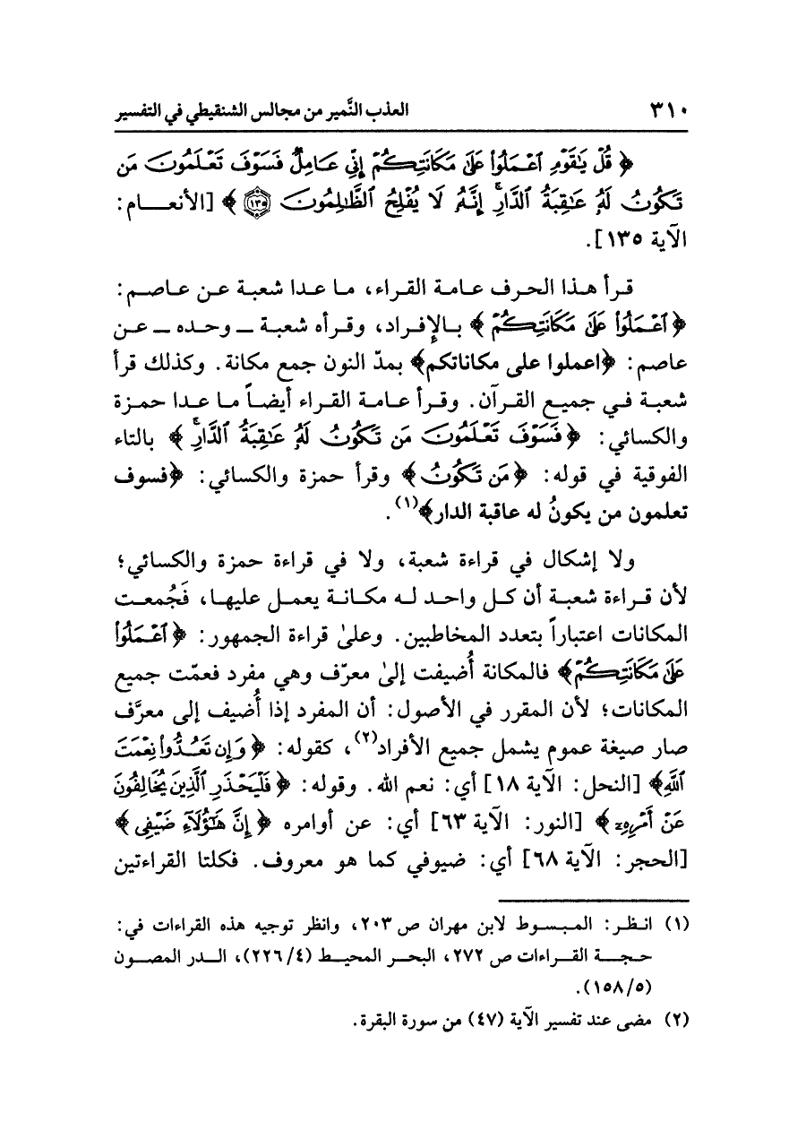 ولا إشكالَ في قراءةِ شعبةَ، ولَا في قراءةِ حمزةَ والكسائيِّ؛ لأن قراءةَ شعبةَ أن كُلَّ واحدٍ له مكانةٌ يَعْمَلُ عليها، فَجُمِعَتِ المكاناتُ اعتبارًا بتعددِ المخاطَبين. وعلى قراءةِ الجمهورِ: {اعْمَلُوا عَلَى مَكَانَتِكُمْ} فالمكانةُ أُضِيفَتْ إلى مُعَرَّفٍ وهي مفردٌ فَعَمَّتْ جميعَ المكاناتِ؛ لأن المقررَ في الأصولِ: أن المفردَ إذا أُضِيفَ إلى مُعَرَّفٍ صَارَ صيغةَ عمومٍ يشملُ جميعَ الأفرادِ (¬٢)، كقولِه: {وَإِنْ تَعُدُّوا نِعْمَةَ اللَّهِ} [النحل: الآية ١٨] أي: نِعَمَ اللَّهِ. وقوله: {فَلْيَحْذَرِ الَّذِينَ يُخَالِفُونَ عَنْ أَمْرِهِ} [النور: الآية ٦٣] أي: عن أوامرِه {إِنَّ هَؤُلَاءِ ضَيْفِي} [الحجر: الآية ٦٨] أي: ضُيُوفِي كما هو معروفٌ. فَكِلْتَا القراءتين
