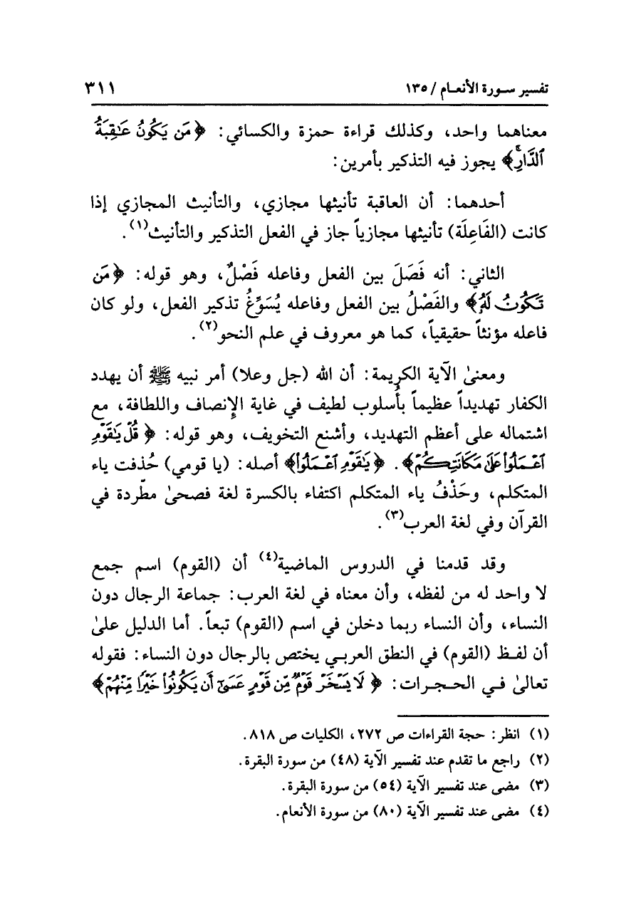 ومعنَى الآيةِ الكريمةِ: أن الله (جل وعلا) أَمَرَ نَبِيَّهُ - صلى الله عليه وسلم - أن يهددَ الكفارَ تَهْدِيدًا عظيمًا بأُسلوبٍ لطيفٍ في غايةِ الإنصافِ واللطافةِ، مع اشتمالِه على أعظمِ التهديدِ، وأشنعِ التخويفِ، وهو قولُه: {قُلْ يَا قَوْمِ اعْمَلُوا عَلَى مَكَانَتِكُمْ}. {يَا قَوْمِ اعْمَلُوا} أصلُه: (يَا قَوْمِي) حُذِفَتْ ياءُ المتكلمِ، وحَذْفُ ياءِ المتكلمِ اكتفاءً بالكسرةِ لغةٌ فُصْحَى مُطَّرِدَةٌ في القرآنِ وفي لغةِ العربِ (¬٣).