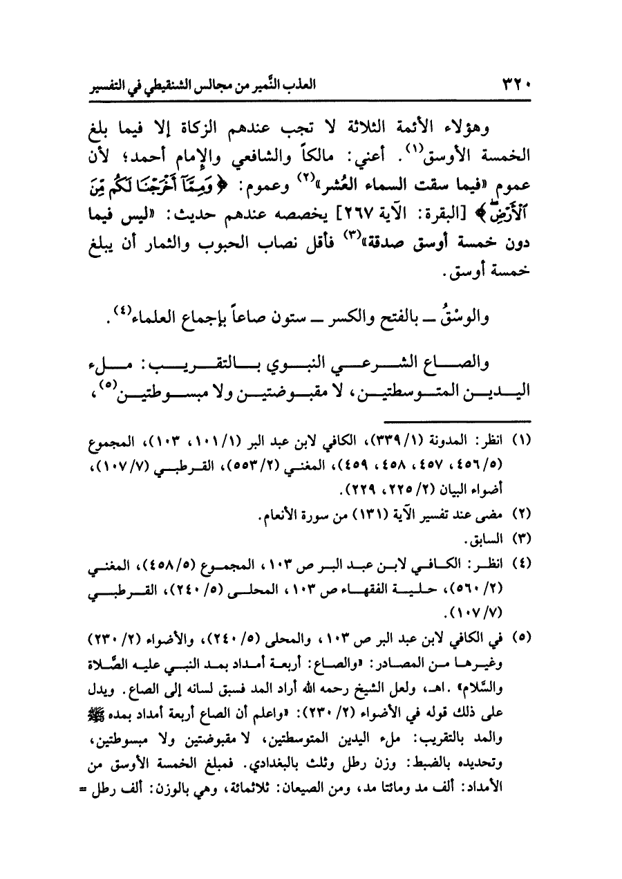 (¬٥) في الكافي لابن عبد البر ص ١٠٣، والمحلى (٥/ ٢٤٠)، والأضواء (٢/ ٢٣٠) وغيرها من المصادر: «والصاع: أربعة أمداد بمد النبي عليه الصلاة والسلام» اهـ. ولعل الشيخ رحمه الله أراد المد فسبق لسانه إلى الصاع. ويدل على ذلك قوله في الأضواء (٢/ ٢٣٠): «واعلم أن الصاع أربعة أمداد بمده - صلى الله عليه وسلم - والمد بالتقريب: ملء اليدين المتوسطتين، لا مقبوضتين ولا مبسوطتين، وتحديده بالضبط: وزن رطل وثلث بالبغدادي. فمبلغ الخمسة الأوسق من الأمدد: ألف مد ومائتا مد، ومن الصيعان: ثلاثمائة، وهي بالوزن: ألف رطل وستمائة رطل. والرطل: وزن مائة وثمانية وعشرين درهمًا مكيًّا، وزاد بعض أهل العلم: أربعة أسباع درهم، كل درهم وزن خَمْسِين وخُمُسَي حبة من مطلق الشعير ... » اهـ.