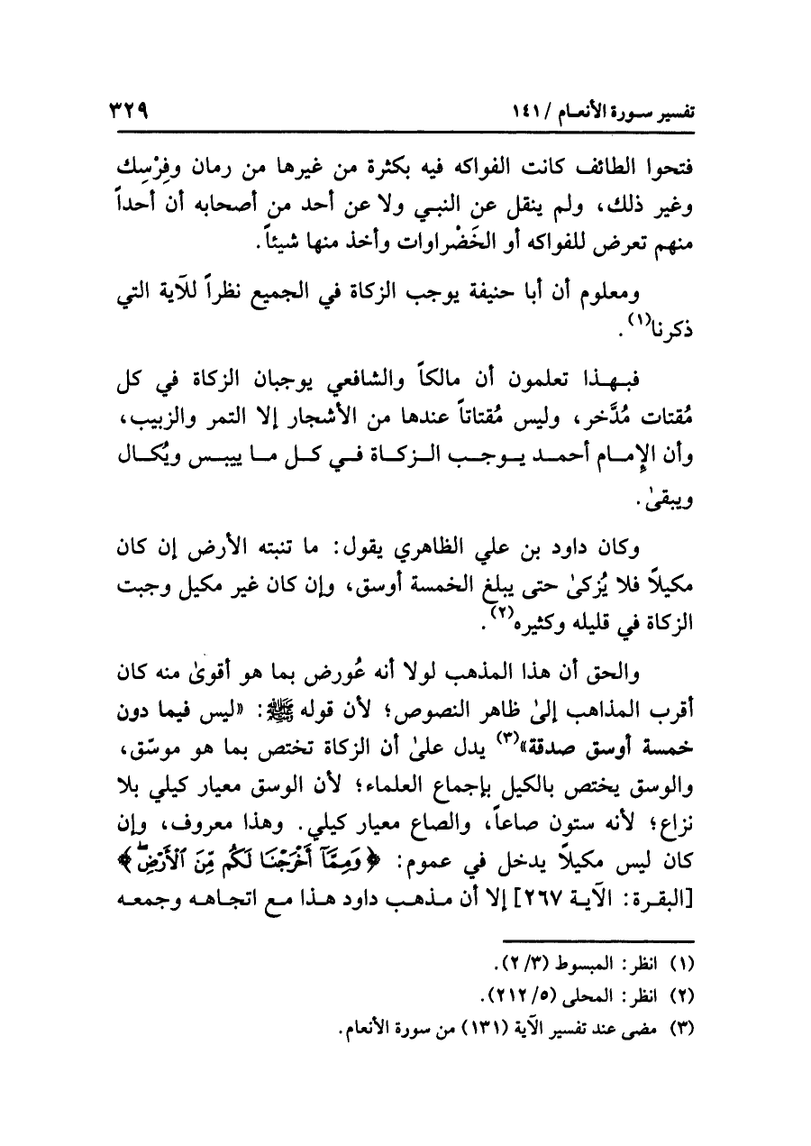 فبهذا تعلمون أن مالكاً والشافِعِيَّ يُوجِبَان الزكاة في كلِّ مُقتات مُدَّخر، وليس مُقتاتاً عندها من الأشجار إلا التمر والزَّبِيب، وأن الإمام أحمد يوجب الزكاة في كل ما ييبس ويُكالُ ويَبْقَى.