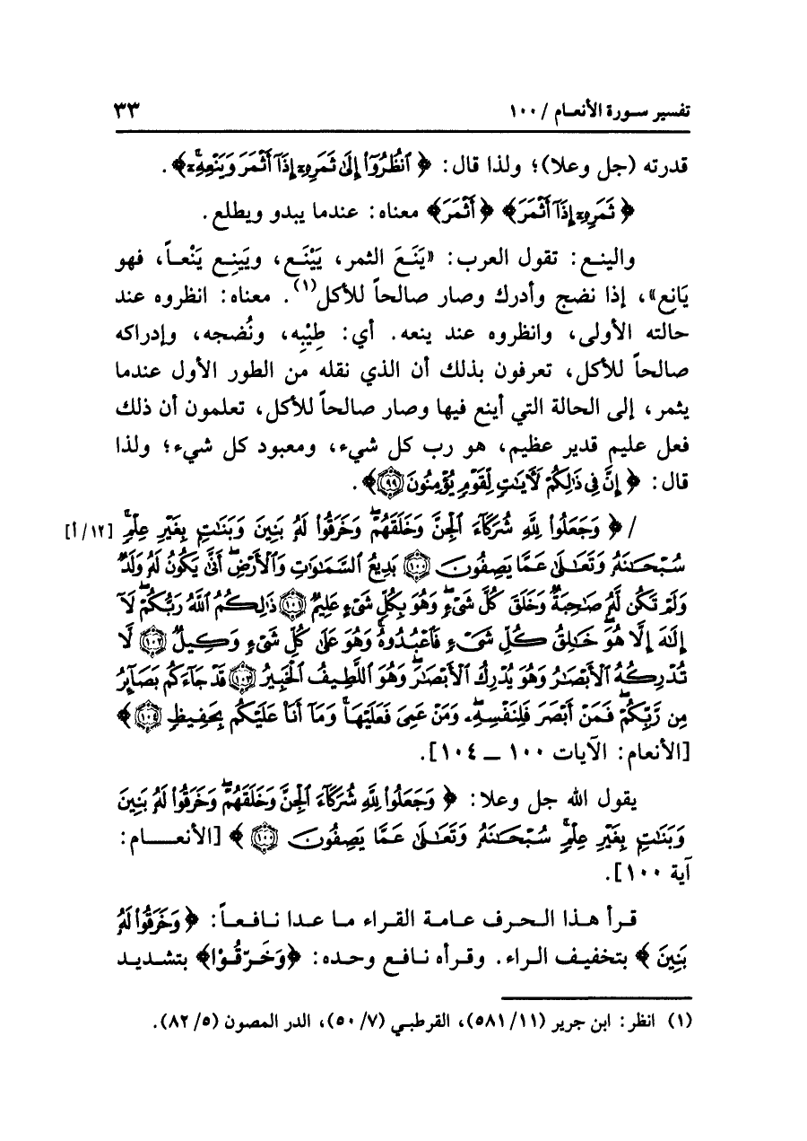 [١٢/أ] / {وَجَعَلُوا لِلَّهِ شُرَكَاءَ الْجِنَّ وَخَلَقَهُمْ وَخَرَقُوا لَهُ بَنِينَ وَبَنَاتٍ بِغَيْرِ عِلْمٍ سُبْحَانَهُ وَتَعَالَى عَمَّا يَصِفُونَ (١٠٠) بَدِيعُ السَّمَاوَاتِ وَالأَرْضِ أَنَّى يَكُونُ لَهُ وَلَدٌ وَلَمْ تَكُن لَّهُ صَاحِبَةٌ وَخَلَقَ كُلَّ شَيْءٍ وهُوَ بِكُلِّ شَيْءٍ عَلِيمٌ (١٠١) ذَلِكُمُ اللَّهُ رَبُّكُمْ لَا إِلَهَ إِلَاّ هُوَ خَالِقُ كُلِّ شَيْءٍ فَاعْبُدُوهُ وَهُوَ عَلَى كُلِّ شَيْءٍ وَكِيلٌ (١٠٢) لَاّ تُدْرِكُهُ الأَبْصَارُ وَهُوَ يُدْرِكُ الأَبْصَارَ وَهُوَ اللَّطِيفُ الْخَبِيرُ (١٠٣) قَدْ جَاءَكُمْ بَصَائِرُ مِن رَّبِّكُمْ فَمَنْ أَبْصَرَ فَلِنَفْسِهِ وَمَنْ عَمِيَ فَعَلَيْهَا وَمَا أَنَا عَلَيْكُم بِحَفِيظٍ (١٠٤)} [الأنعام: الآيات ١٠٠ - ١٠٤].