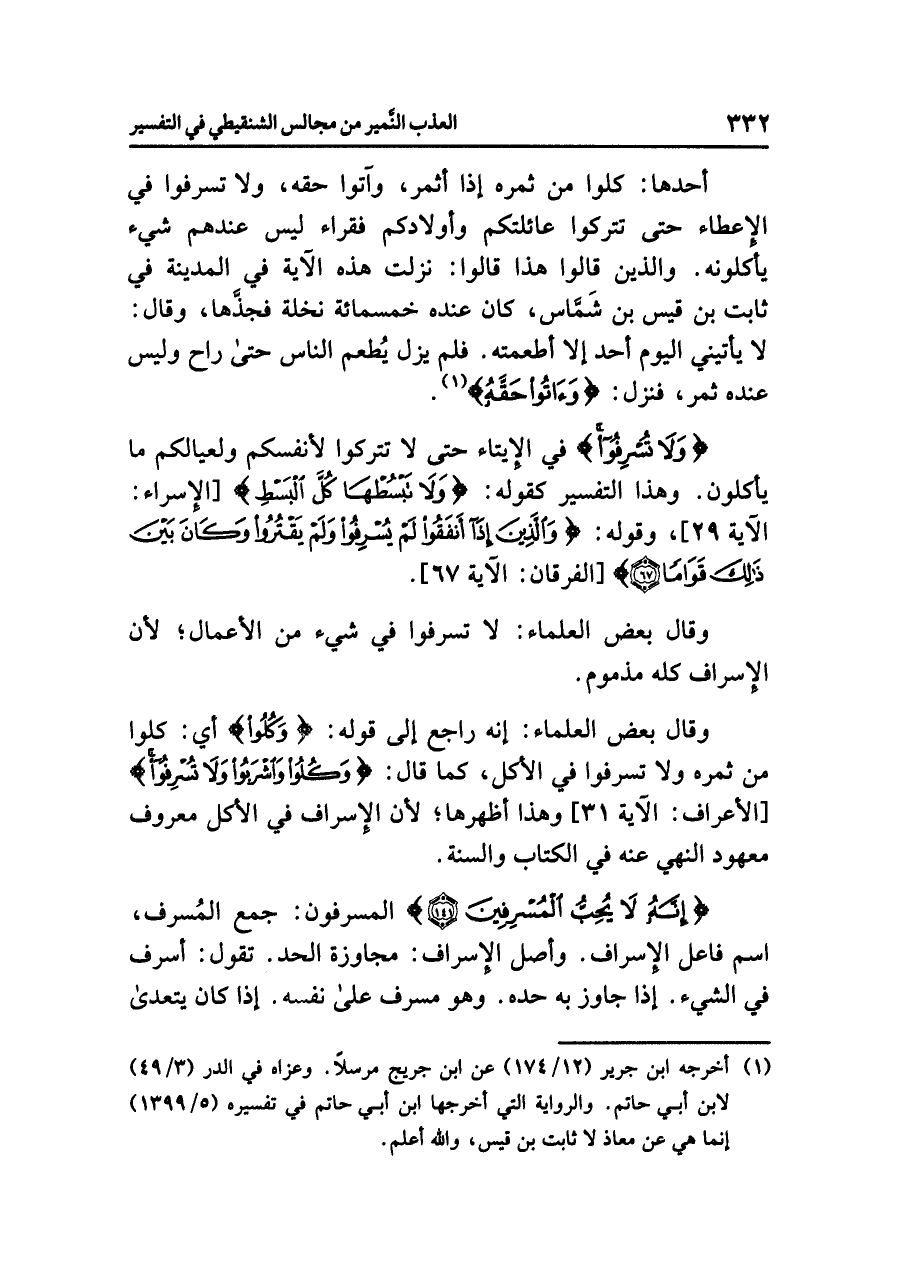 {وَلَا تُسْرِفُواْ} في الإيتاء حتى لا تتركوا لأنفسكم ولعيالكم ما يأكلون، وهذا التفسير كقوله: {وَلَا تَبْسُطْهَا كُلَّ الْبَسْطِ} [الإسراء: الآية ٢٩]، وقوله: {وَالَّذِينَ إِذَا أَنفَقُوا لَمْ يُسْرِفُوا وَلَمْ يَقْتُرُوا وَكَانَ بَيْنَ ذَلِكَ قَوَاماً} [الفرقان: الآية ٦٧].