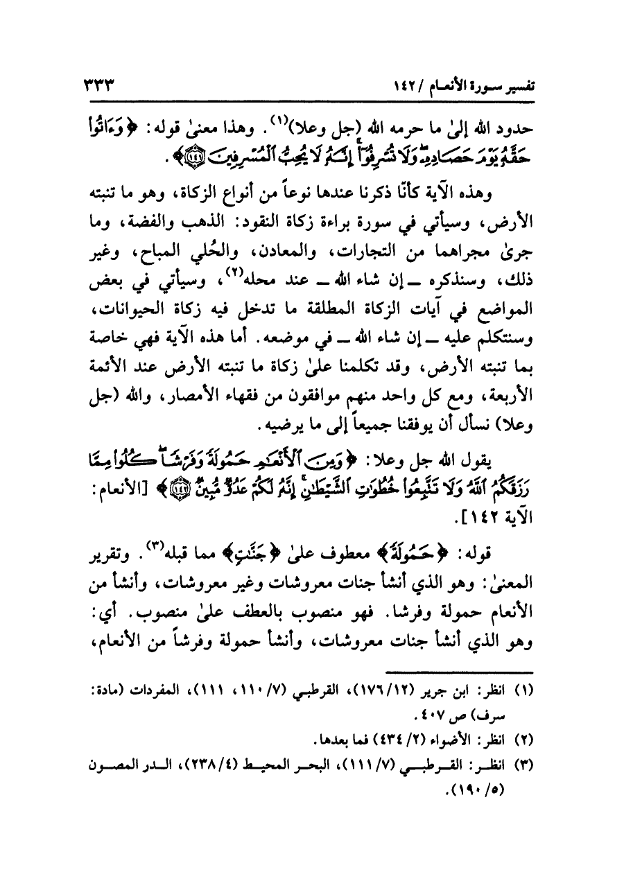 حدود الله إلى ما حَرَّمَه الله (جل وعلا) (¬١). وهذا معنى قوله: {وَآتُواْ حَقَّهُ يَوْمَ حَصَادِهِ وَلَا تُسْرِفُواْ إِنَّهُ لَا يُحِبُّ المُسْرِفِينَ}.
