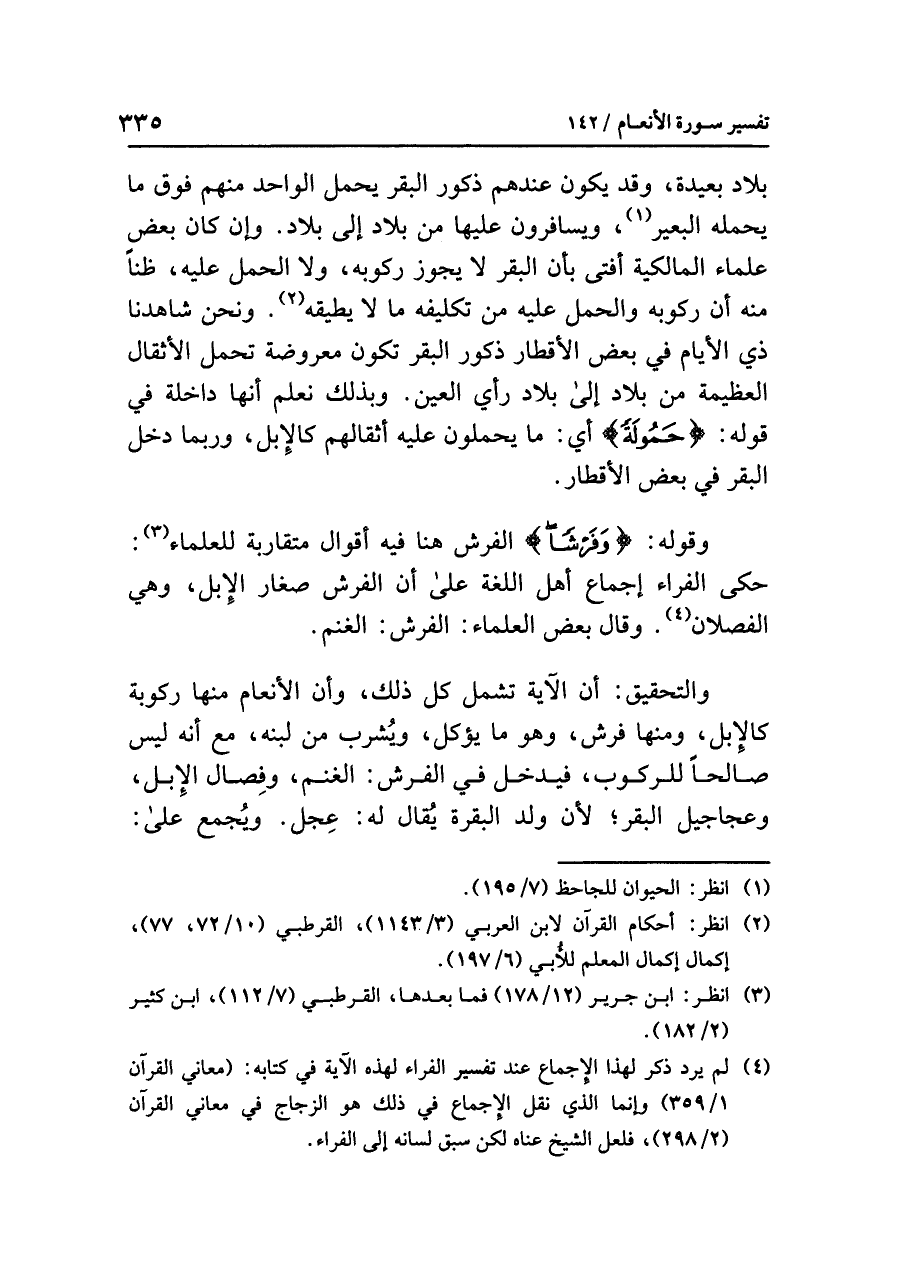 بلاد بعيدة، وقد يكون عندهم ذكور البقر يحمل الواحد منهم فوق ما يحمله البعير (¬١)، ويسافرون عليها من بلاد إلى بلاد، وإن كان بعض علماء المالكية أفتى بأن البقر لا يجوز ركوبه، ولا الحمل عليه، ظنًّا منه أن ركوبه والحَمْلَ عليه من تَكْلِيفِهِ ما لا يطيقه (¬٢)، ونحن شاهدنا ذي الأيام في بعض الأقطار ذكور البقر تكون معروضة تحمل الأثقال العظيمة من بلاد إلى بلاد رَأْيَ العين، وبذلك نعلم أنها داخلة في قوله: {حَمُولَةً} أي: ما يحملون عليه أثقالهم كالإبل، وربما دخل البقر في بعض الأقطار.