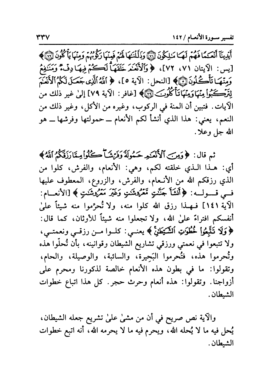 ثم قال: {وَمِنَ الأَنْعَامِ حَمُولَةً وَفَرْشاً كُلُواْ مِمَّا رَزَقَكُمُ اللهُ} أي: هذا الذي خلقته لكم، وهي: الأنعام، والفرش، كلوا من الذي رزقكم الله من الأنعام، والفرش، والزروع، المعطوف عليها في قوله: {أَنشَأَ جَنَّاتٍ مَّعْرُوشَاتٍ وَغَيْرَ مَعْرُوشَاتٍ} [الأنعام: الآية ١٤١] فهذا رزق الله كلوا منه، ولا تُحرِّموا منه شيئاً على أنفسكم افتراء على الله، ولا تجعلوا منه شيئًا للأوثان، كما قال: {وَلَا تَتَّبِعُواْ خُطُوَاتِ الشَّيْطَانِ} يعني: كلوا من رزقي ونعمتي، ولا تتبعوا في نعمتي ورزقي تشاريع الشيطان وقوانينه، بأن تُحلّوا هذه وتُحرموا هذه، فتُحرموا البَحِيرة والسائبة، والوصيلة، والحام، وتقولوا: ما في بطون هذه الأنعام خالصة لذكورنا ومحرم على أزواجنا، وتقولوا: هذه أنعام وحرث حجر، كل هذا اتباع خطوات الشيطان.