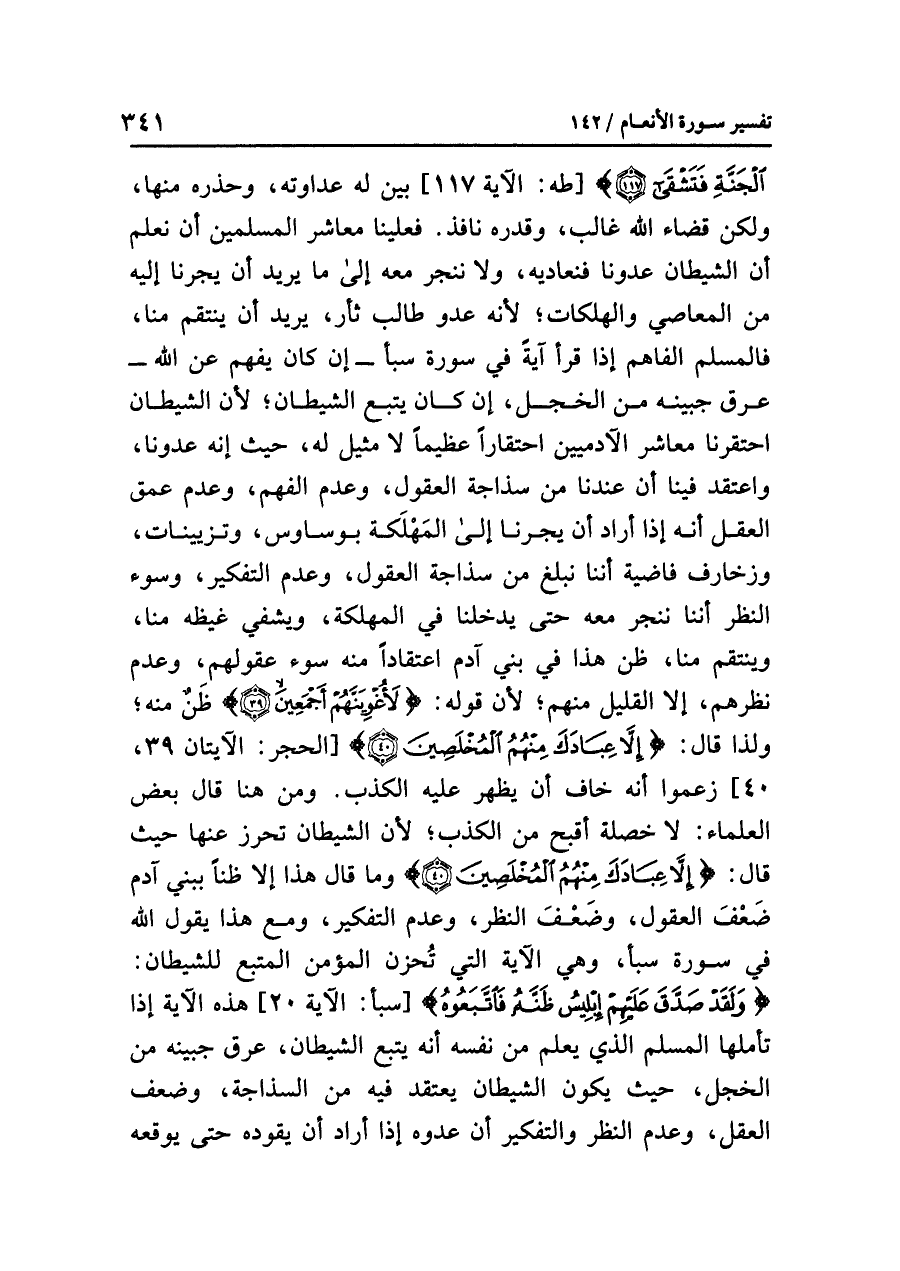 عداوته، وحذره منها، ولكن قضاء الله غالب، وقدره نافذ، فعلينا معاشر المسلمين أن نعلم أن الشيطان عدونا فنعاديه، ولا ننجرّ معه إلى ما يريد أن يجرَّنَا إليه من المعاصي والهلكات؛ لأنه عَدُوٌّ طَالِبُ ثَأْرٍ، يريد أن ينتقم منا، فالمسلم الفاهم إذا قَرَأَ آية في سورة سبأ - إن كان يَفْهَم عن الله - عرق جبينه من الخَجَل إن كان يتبع الشيطان؛ لأن الشيطان احتقرنا معاشر الآدميين احتقاراً عظيماً لا مثيل له، حيث إنه عدونا، واعتقد فينا أن عندنا من سَذَاجة العقول، وعدم الفهم، وعدم عمق العقل أنه إذا أراد أن يجرنا إلى المَهْلَكة بوساوس، وتزيينات وزخارف فاضية أننا نبلغ من سذاجة العقول وعدم التفكير وسوء النظر أننا ننجَرُّ معه حتَّى يُدْخِلَنَا في المهلكة، ويشفي غَيْظَهُ مِنّا، وينتقم منا، ظن هذا في بني آدم اعتقاداً منه سوء عُقُولهِم، وعدم نظرهم، إلا القليل منهم؛ لأن قوله: {لأُغْوِيَنَّهُمْ أَجْمَعِينَ} ظَنٌّ منه؛ ولذا قال: {إِلَاّ عِبَادَكَ مِنْهُمُ المُخْلَصِينَ} [الحجر: الآيتان ٣٩، ٤٠] زعموا أنه خاف أن يَظْهَرَ عليه الكذب. ومن هنا قال بعض العلماء: لا خصلة أقبح مِنَ الكَذِب؛ لأن الشيطان تحرَّزَ عنها حيث قال: {إِلَاّ عِبَادَكَ مِنْهُمُ المُخْلَصِينَ} وما قال هذا إلا ظنّاً ببني آدم ضَعْفَ العقول، وضَعْفَ النظر، وعدم التفكير، ومع هذا يقول الله في سورة سبأ، وهي الآية التي تُحزن المؤمن المتبع للشيطان: {وَلَقَدْ صَدَّقَ عَلَيْهِمْ إِبْلِيسُ ظَنَّهُ فَاتَّبَعُوهُ} [سبأ: الآية ٢٠] هذه الآية إذا تَأَمَّلَها المسلم الذي يعلم من نفسه أنه يتبع الشيطان عرق جبينه من الخجل، حيث يكون الشيطان يعتقد فيه من السذاجة وضعف العقل، وعدم النظر والتفكير أن عدوه إذا أراد أن يقوده حتى يوقعه