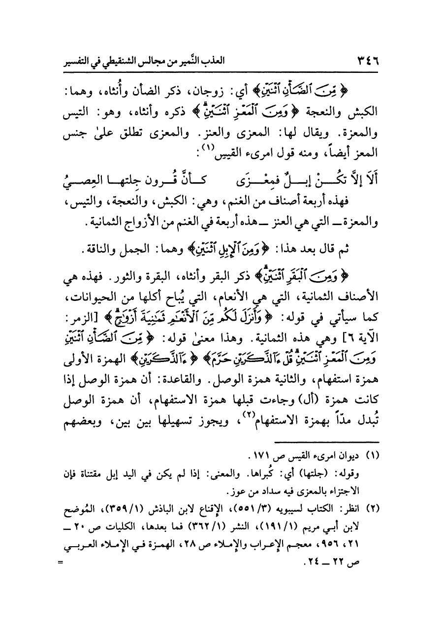 {وَمِنَ الْبَقَرِ اثْنَيْنِ} ذكر البقر وأنثاه، البقرة والثور. فهذه هي الأصناف الثمانية، التي هي الأنعام، التي يُباح أكلها من الحيوانات، كما سيأتي في قوله: {وَأَنزَلَ لَكُم مِّنْ الْأَنْعَامِ ثَمَانِيَةَ أَزْوَاجٍ} [الزمر: الآية ٦] وهي هذه الثمانية. وهذا معنى قوله: {مِّنَ الضَّأْنِ اثْنَيْنِ وَمِنَ المَعْزِ اثْنَيْنِ قُلْءَآلذَّكَرَيْنِ حَرَّمَ} {ءَآلذَّكَرَيْنِ} الهمزة الأولى همزة استفهام، والثانية همزة الوصل. والقاعدة: أن همزة الوصل إذا كانت همزة (أل) وجاءت قبلها همزة الاستفهام، أن همزة الوصل تُبدل مدّاً بهمزة الاستفهام (¬٢)، ويجوز تسهيلها بين بين، وبعضهم