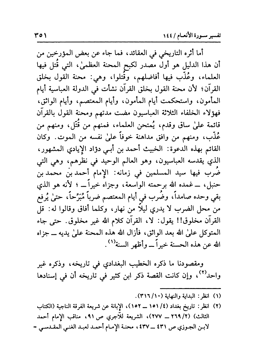 أما أثره التاريخي في العقائد، فما جاء عن بعض المؤرخين من أن هذا الدليل هو أول مصدر لكبح المحنة العظمى التي قُتل فيها العلماء وعُذّب فيها أفاضلهم وقُتلوا، وهي محنة القول بِخَلْقِ القُرْآن؛ لأن محنة القول بخلق القرآن نشأت في الدولة العباسية أيام المأمون، واستحكمت أيام المأمون وأيام المعتصم وأيام الواثق، فهؤلاء الخلفاء الثلاثة العباسيون مضت مدتهم ومحنة القول بالقرآن قائمة على ساق وقدم، يُمتحن العلماء، فمنهم من قُتل، ومنهم من عُذّب، ومنهم من وافق مداهنة خوفاً على نفسه من الموت، وكان القائم بهذه الدعوة: الخبيث أحمد بن أبي دؤاد الإيادي المشهور، الذي يقدسه العباسيون، وهو العالم الوحيد في نَظَرِهِمْ، وهي التي ضُرب فيها سيد المسلمين في زمانه: الإمام أحمد بن محمد بن حنبل - غمده الله برحمته الواسعة، وجزاه خيراً - لأنه هو الذي بقي وحده صامداً، وضُرب في أيام المعتصم ضربًا مُبَرِّحاً، حتى يُرفع من محل الضرب لا يدري ليلاً من نهار، وكلما أفاق وقالوا له: قل القرآن مخلوق!! يقول: لا، القرآن كلام الله غير مخلوق، حتى جاء المتوكل على الله بعد الواثق، فأزال الله هذه المحنة على يديه -جزاه الله عن هذه الحسنة خيراً- وأظهر السنة (¬١).
