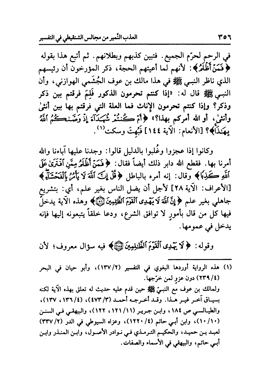 في الرحم لحرّم الجميع، فتبين كذبهم وبطلانهم، ثم أتبع هذا بقوله: {فَمَنْ أَظْلَمُ}؛ لأنهم لما أعيتهم الحجة، ذكر المؤرخون أن رئيسهم الذي ناظر النبي - صلى الله عليه وسلم - في هذا مالك بن عوف الجُشَمي الهوازني، وأن النبي - صلى الله عليه وسلم - قال له: «إذا كنتم تحرمون الذكور فَلِمَ فرقتم بين ذَكَرٍ وذَكَرٍ؟ وإذا كنتم تحرِّمون الإناث فما العِلَّة التي فَرَّقْتُمْ بِهَا بَيْنَ أنْثَى وأُنْثَى، أو الله أمَرَكُمْ بهذا؟» {أَمْ كُنتُمْ شُهَدَاء إِذْ وَصَّاكُمُ اللهُ بِهَذَا} [الأنعام: الآية ١٤٤] فَبُهِتَ وسكت (¬١).