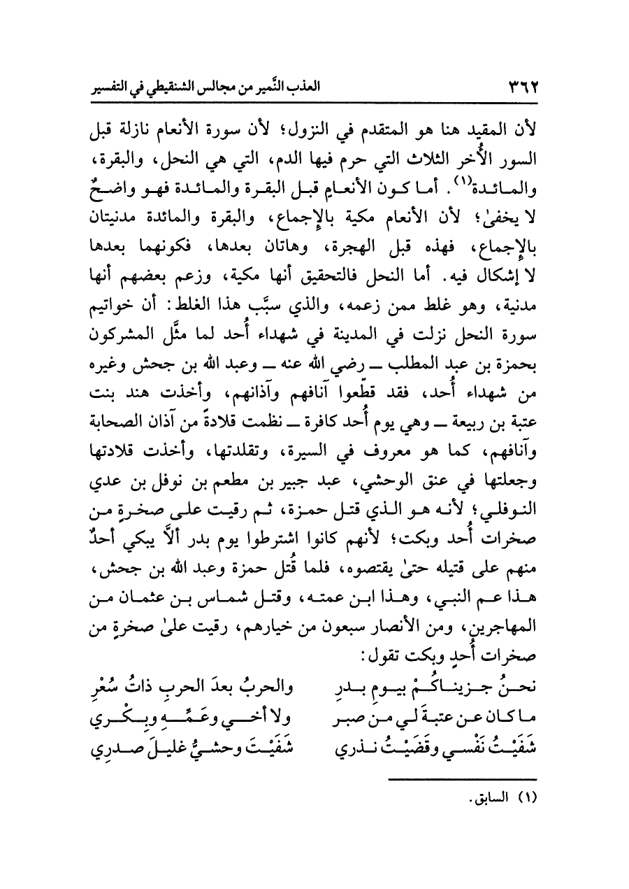 أما كون الأنعام قبل البقرة والمائدة فهو واضحٌ لا يخفى؛ لأن الأنعام مكية بالإجماع، والبقرة والمائدة مدنيتان بالإجماع، فهذه قبل الهجرة، وهاتان بعدها، فكونهما بعدها لا إشكال فيه، أما النحل فالتحقيق أنَّهَا مكية، وزعم بعضهم أنها مدنيَّة، وهو غلط ممن زعمه، والذي سبَّب هذا الغلط: أن خواتيم سورة النحل نزلت في المدينة في شهداء أُحد لما مثَّل المشركون بحمزة بن عبد المطلب - رضي الله عنه - وعبد الله بن جحش وغيره من شهداء أُحد، فقد قطّعوا آنافهم وآذانهم، وأخذت هند بنت عتبة بن ربيعة - وهي يوم أُحد كافرة - نظمت قلادة من آذان الصحابة وآنافهم، كما هو معروف في السيرة، وتقلدتها، وأخذت قلادتها وجعلتها في عنق الوحشي عبد جبير بن مطعم بن نوفل بن عدي النوفلي؛ لأنه هو الذي قتل حمزة، ثم رقيت على صخرة من صخرات أُحُدٍ وبَكَتْ؛ لأنهم كانوا اشترطوا يوم بدر ألَّا يبكي أَحدٌ منهم على قتيله حتى يقتصوه، فلما قُتل حمزة وعبد الله بن جحش، هذا عم النبي وهذا ابن عمته، وقتل شماس بن عثمان من المهاجرين، ومن الأنصار سبعون من خيارهم، رقيت على صخرة من صخرات أُحدٍ وبكت تقول: