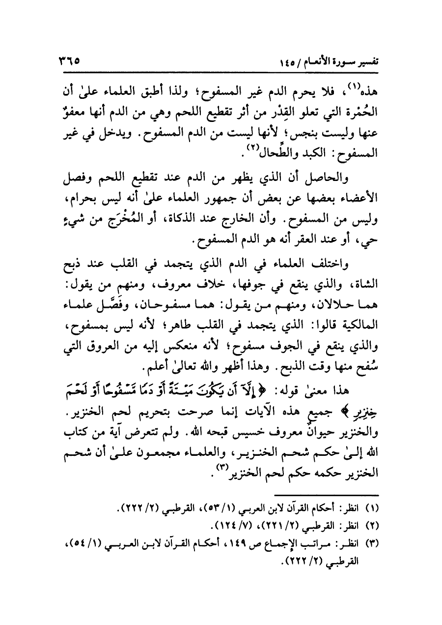 هذا معنى قوله: {إِلَاّ أَن يَكُونَ مَيْتَةً أَوْ دَماً مَّسْفُوحاً أَوْ لَحْمَ خِنزِيرٍ} جميع هذه الآيات إنما صرحت بتحريم لحم الخنزير، والخنزير حيوانٌ معروف خسيس قَبَّحَهُ الله. ولم تَتَعَرّض آية من كتاب الله إلى حكم شحم الخنزير، والعلماء مُجْمِعُونَ على أنَّ شَحْمَ الخنزير حكمه حكم لحم الخنزير (¬٣).