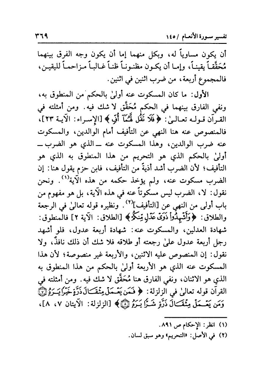 الأول: ما كان المسكوت عنه أولى بالحكم من المنطوق به، ونفي الفارق بينهما في الحكم مُحَقَّق لا شك فيه. ومن أمثلته في القرآن قوله تعالى: {فَلَا تَقُل لَّهُمَا أُفٍّ} [الإسراء: الآية ٢٣]، فالمنصوص عنه هنا النهي عن التأفيف أمام الوالدين، والمسكوت عنه ضرب الوالدين، وهذا المسكوت عنه- الذي هو الضرب- أولى بالحكم الذي هو التحريم من هذا المنطوق به الذي هو التأفيف؛ لأن الضرب أشد أذيةً من التأفيف، فابن حزم يقول هنا: إن الضرب مسكوت عنه، ولم يؤخذ حكمه من هذه الآية (¬١). ونحن نقول: لا، الضرب ليس مسكوتاً عنه في هذه الآية، بل هو مفهوم من باب أولى من النهي عن [التأفيف] (¬٢).