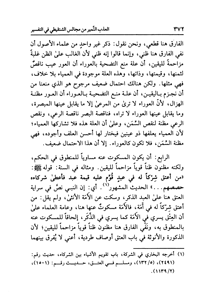 الرابع: أن يكون المسكوت عنه مساوياً للمنطوق في الحكم، ولكنه مظنون ظنّاً قويّاً مزاحماً لليقين، ومثاله في السنة: قوله - صلى الله عليه وسلم -: «مَنْ أَعْتَقَ شِرْكاً لَهُ فِي عَبْدٍ قُوِّمَ عَلَيْهِ قِيمَةَ عَبْدٍ فَأَعْطَى شُرَكَاءَهُ حِصَصَهُمْ ... » الحديث المشهور (¬١). أي: إن النبي نصَّ في سراية العتق هنا على العبد الذكر، وسكت عن الأمَة الأنْثَى، ولم يقل: من أعتق شِرْكاً له في أَمَة، فالأَمَة مسكوتٌ عنها هنا، وعامة العلماء على أن العِتق يسري في الأَمَة كما يسري في الذكَر، إلحاقاً للمسكوت عنه بالمنطوق به، ونَفْي الفارق هنا مظنون ظنّاً قويّاً مزاحماً لليقين؛ لأن الذكورة والأنوثة في باب العتق أوصاف طردية، أعني لا يُفرق بينهما