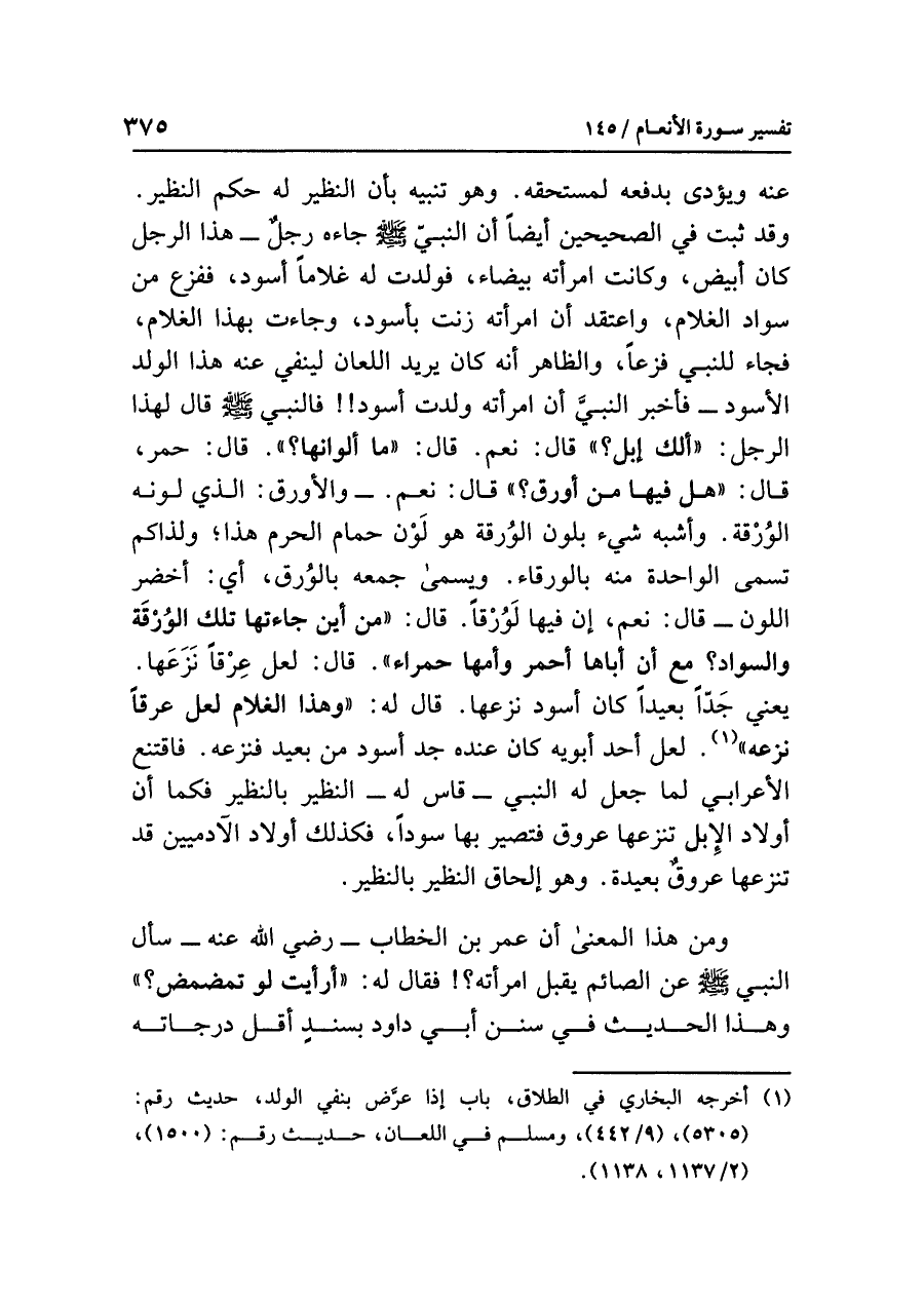 قال: «مَا أَلْوَانُهَا؟» قال: حمر، قال: «هَلْ فِيهَا مِنْ أَوْرَق؟» قال: نعم -والأوْرَق: الذي لونه الوُرْقة، وأشبه شيء بلون الوُرْقَة هو لوْنُ حَمَامِ الحرَمِ هَذَا؛ ولذاكم تسمى الواحدة منه بالوَرْقَاء، ويسمى جمعه بالوُرْق، أي: أخضر اللون- قال: نعم، إن فيها لَوُرْقاً، قال: «مِنْ أَيْنَ جاءَتْها تلك الوُرْقَة والسَّواد؟» مع أن أباها أحمر وأمها حمراء، قال: لعل عِرْقاً نَزَعَها. يعني جَدّاً بعيداً كان أسود نزعها، قال له: «وهَذَا الغُلَامُ لعَلَّ عِرْقاً نزَعَهُ» (¬١). لَعَلَّ أحَدَ أَبَوَيْهِ كان عِنْده جد أسود من بعيد فنزَعَهُ، فاقتنع الأعرابي لما جعل له النبي -قاس له- النظير بالنظير، فَكَمَا أن أولاد الإبل تنزعها عروق فتصير بها سوداً، فكذلك أولاد الآدميين قد تنزعها عروق بعيدة، وهو إلحاق النظير بالنظير.
