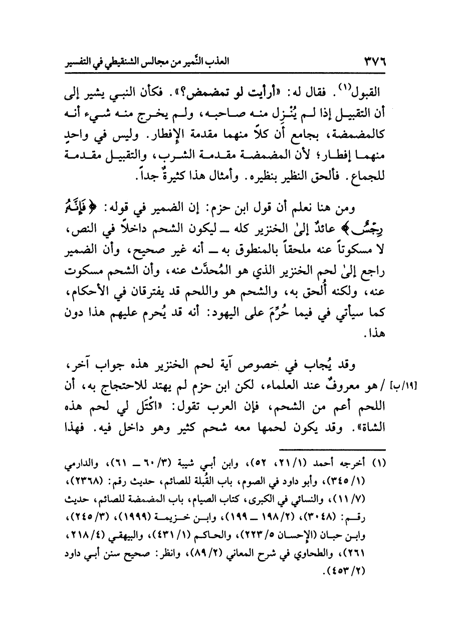 ومن هنا نعلم أن قَوْلَ ابْنِ حَزْمٍ: إن الضمير في قوله: {فَإِنَّهُ رِجْسٌ} عائدٌ إلى الخنزير كله -ليكون الشحم داخلاً في النص، لا مسكوتاً عنه ملحقاً بالمنطوق به- أنه غير صحيح، وأن الضمير راجع إلى لحم الخنزير الذي هو المُحدَّث عنه، وأن الشحم مسكوت عنه، ولكنه أُلحق به، والشحم هو واللحم قد يفترقان في الأحكام، كما سيأتي فيما حُرِّمَ على اليهود: أنه قد يُحْرَمُ عَلَيْهِمْ هذا دون هذا.