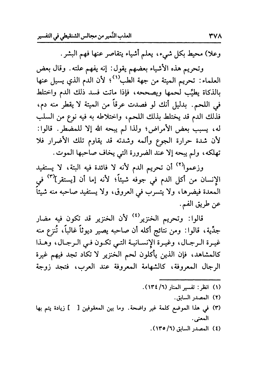 وَتَحْرِيم هذه الأشياء بعضهم يقول: إنه يفهم علته، وقال بعض العلماء: تحريم الميتة من جهة الطب (¬١)؛ لأن الدم الذي يسيل عنها بالذكاة يطيِّب لحْمَهَا ويُصَحِّحُهُ، فإذا ماتَتْ فَسَدَ ذلك الدَّمُ واخْتَلَطَ في اللحم، بدليل أنَّكَ لو فصدت عِرْقاً مِنَ الميتة لا يقطر منه دم، فذلك الدم قد يختلط بذلك اللحم، واختلاطه به فيه نوع من السلب له، يسبب بعض الأمراض، ولذا لم يُبِحْهُ الله إلا للمضْطَرِّ، قالوا: لأن شدة حرارة الجوع وألمه وشِدَّتِهِ قد يُقَاوِمُ تلك الأضرار فلا تهْلكه، ولم يبحه إلا عند الضرورة التي يخاف صاحبها الموت.