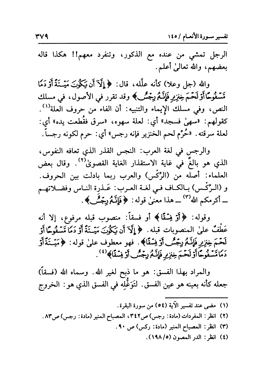والله (جل وعلا) كأنه علَّله، قال: {إِلَّا أَن يَكُونَ مَيْتَةً أَوْ دَماً مَّسْفُوحاً أَوْ لَحْمَ خِنزِيرٍ فَإِنَّهُ رِجْسٌ} وقَدْ تَقَرَّر في الأصول، في مَسْلَكِ النص وفي مسلك الإيماء والتنبيه: أن الفاء من حروف العلة (¬١)، كقولهم: «سَهَا فسجد» أي: لِعِلَّةِ سَهْوِهِ، «سرق فقُطعت يده» أي: لعلة سَرِقَتِهِ، «حُرِّم لحم الخنزير فإنه رجس» أي: حرم لكونه رجساً.