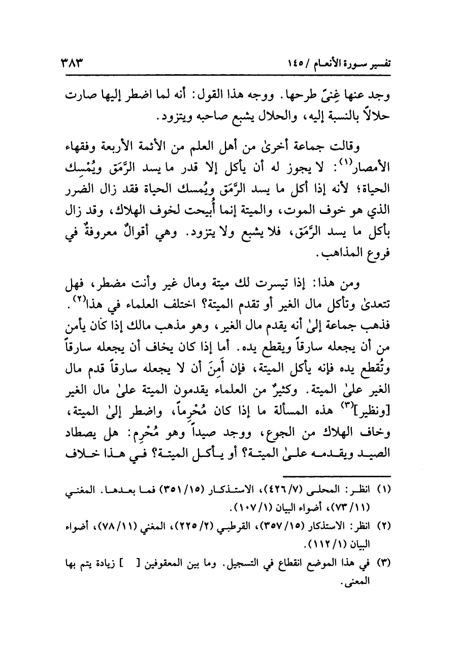 وقالت جماعة أخرى من أهل العلم من الأئمة الأربعة وفقهاء الأمصار (¬١): لا يجوز له أن يأكل إلا قَدْرَ ما يَسُدّ الرَّمَق ويُمسِك الحياة؛ لأنه إذا أكل ما يسد الرَّمق ويُمسك الحياة فقد زال الضَّرَر الذي هو خوف الموت، والميتة إنما أبيحت لخوف الهلاك، وقد زال بِأَكْلِ ما يسد الرَّمَق، فلا يشبع ولا يتزود، وهي أقوالٌ معروفةٌ في فروع المذاهب.