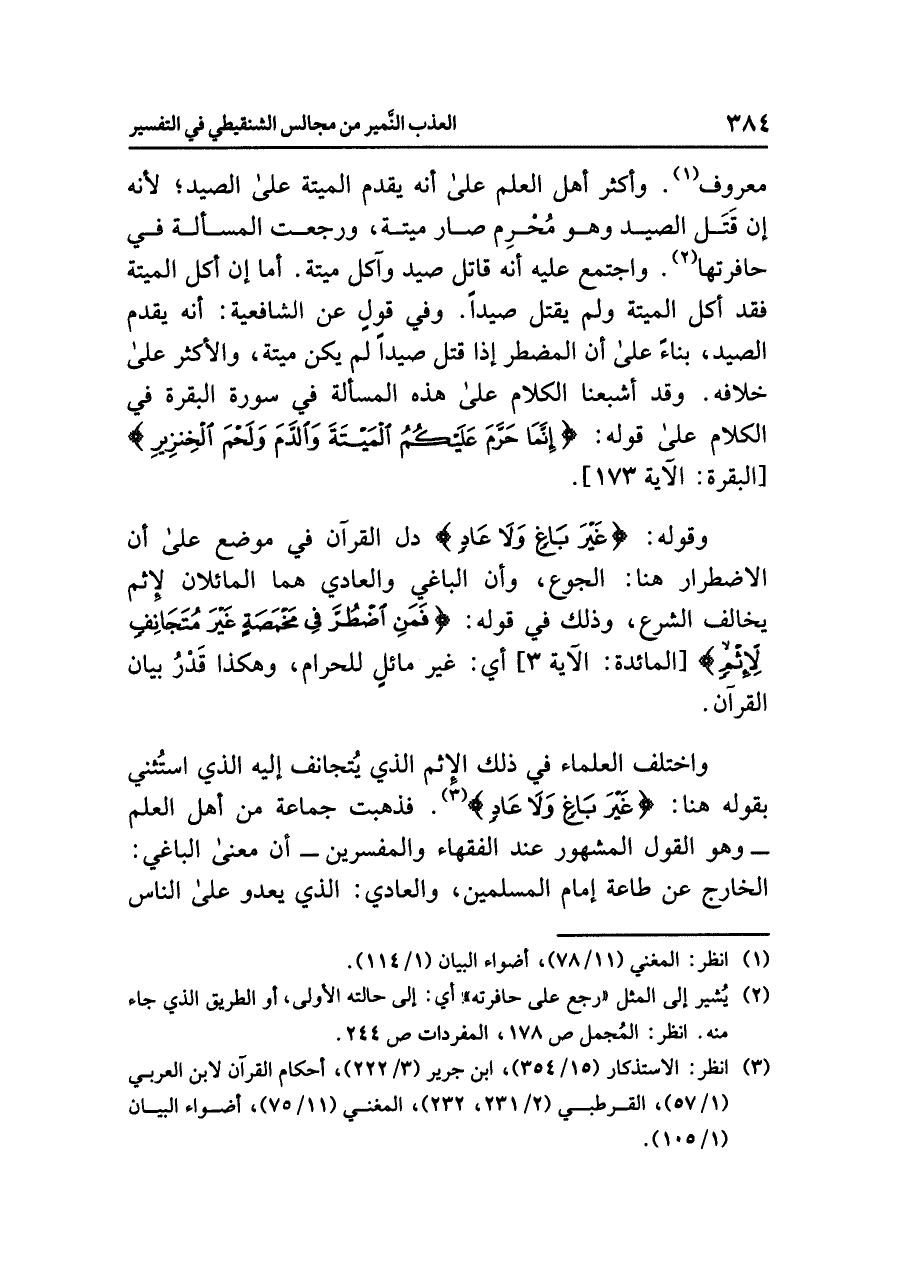 واختلف العلماء في ذلك الإثم الذي يُتجانف إليه الذي استُثني بقوله هنا: {غَيْرَ بَاغٍ وَلَا عَادٍ} (¬٣) فذهبت جماعة من أهل العلم -وهو القول المشهور عند الفقهاء والمفسرين- أن معنى الباغي: الخارج عن طاعة إمام المسلمين، والعادي: الذي يعدو على الناس